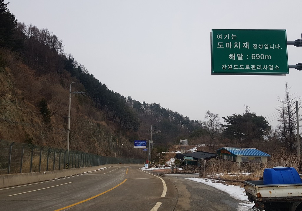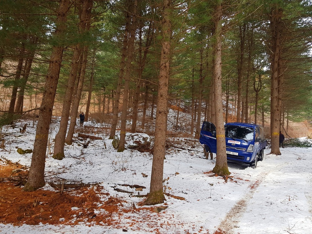 눈길을 조심해서 내려오다 보니 트럭 두대가 올라 온다