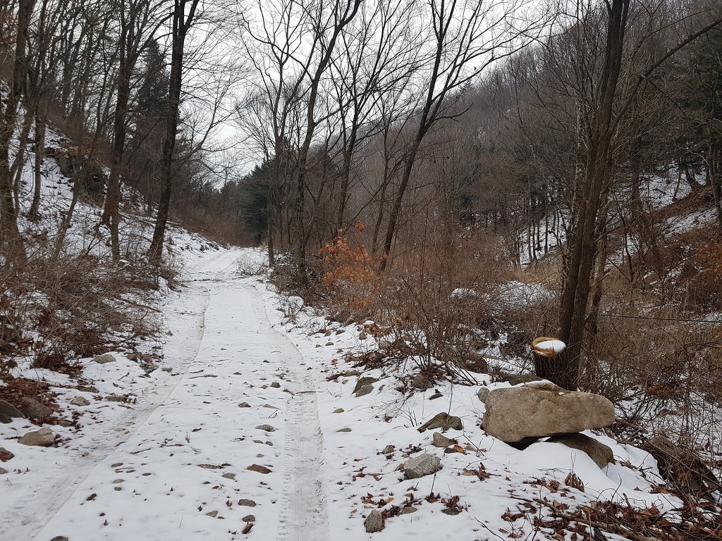 계곡따라 오르다 보니 앙상한 나무가지 아래로 눈이 한뼘이나 쌓여있고 가평천 좌측 울타리(화악지맥길)과 만나게 된다.