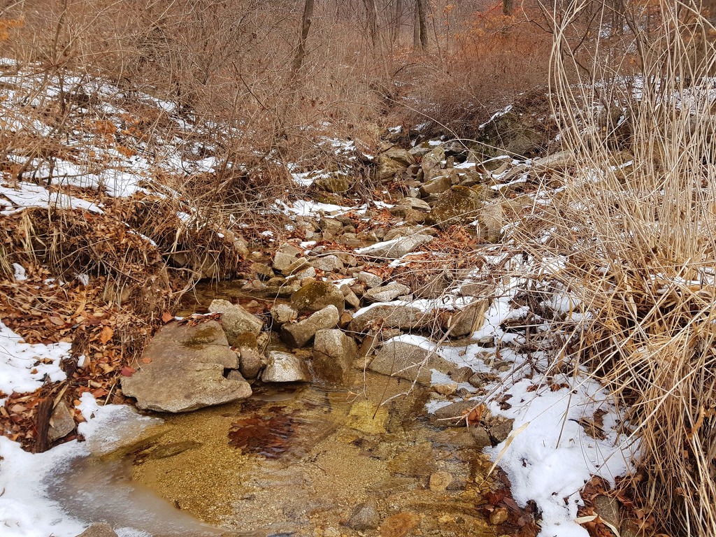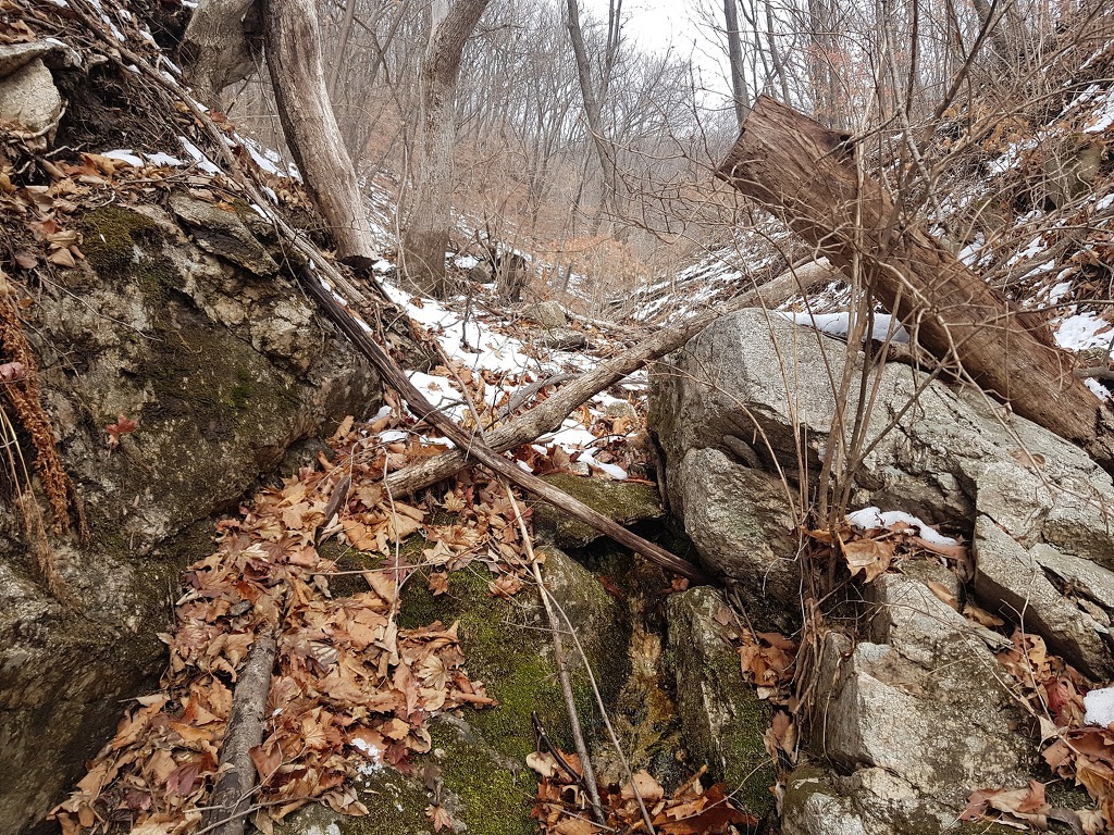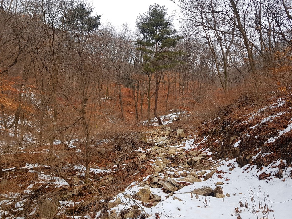 잠시 내려오며 잡목과 낙엽이 많아 아직 이렇다 할 물줄기를 찾지 못 하였지만 물이란 높은곳에서 낮은곳으로 흘러드니 조금 더 내려가면 만날듯 하다.