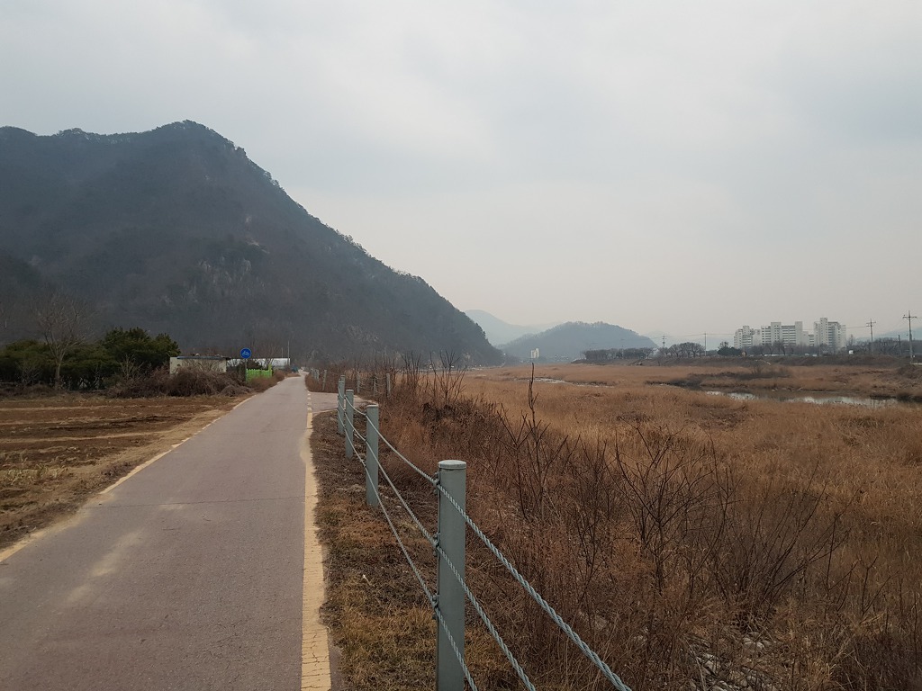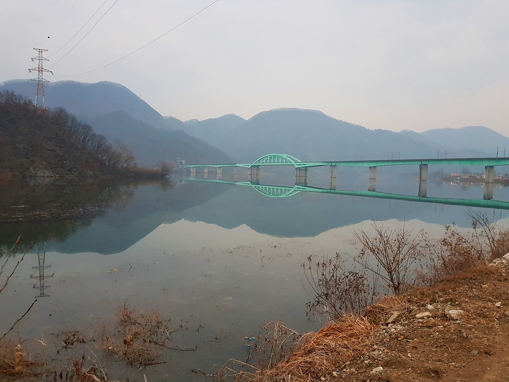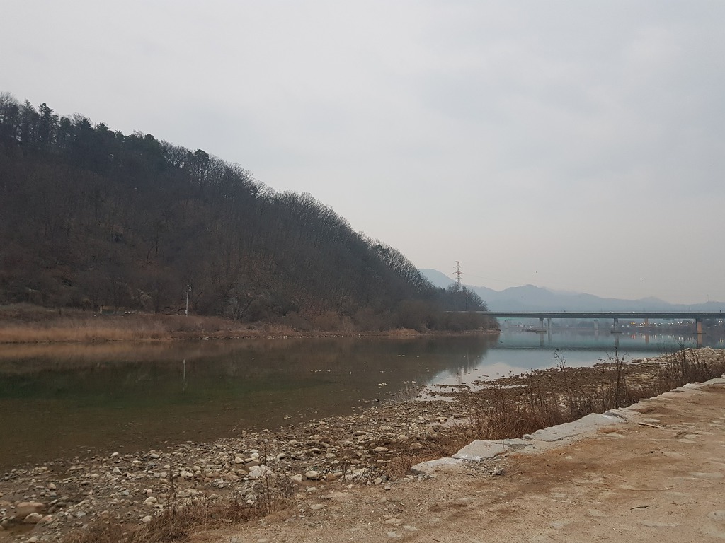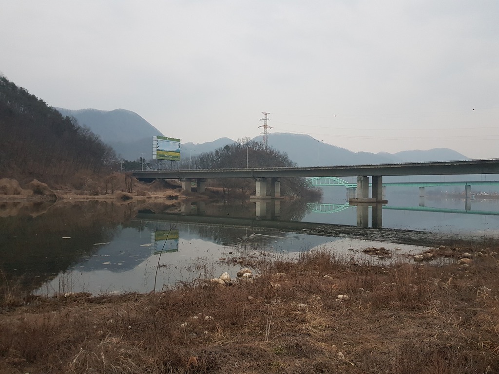 지나온 강과 좌측으로 수정봉이 보이고 가운데 연인산 남쪽과 칼봉산-구나무산-송악산에서 흘러온 승안천이고 우측으로 옥녀봉이 보인다.
