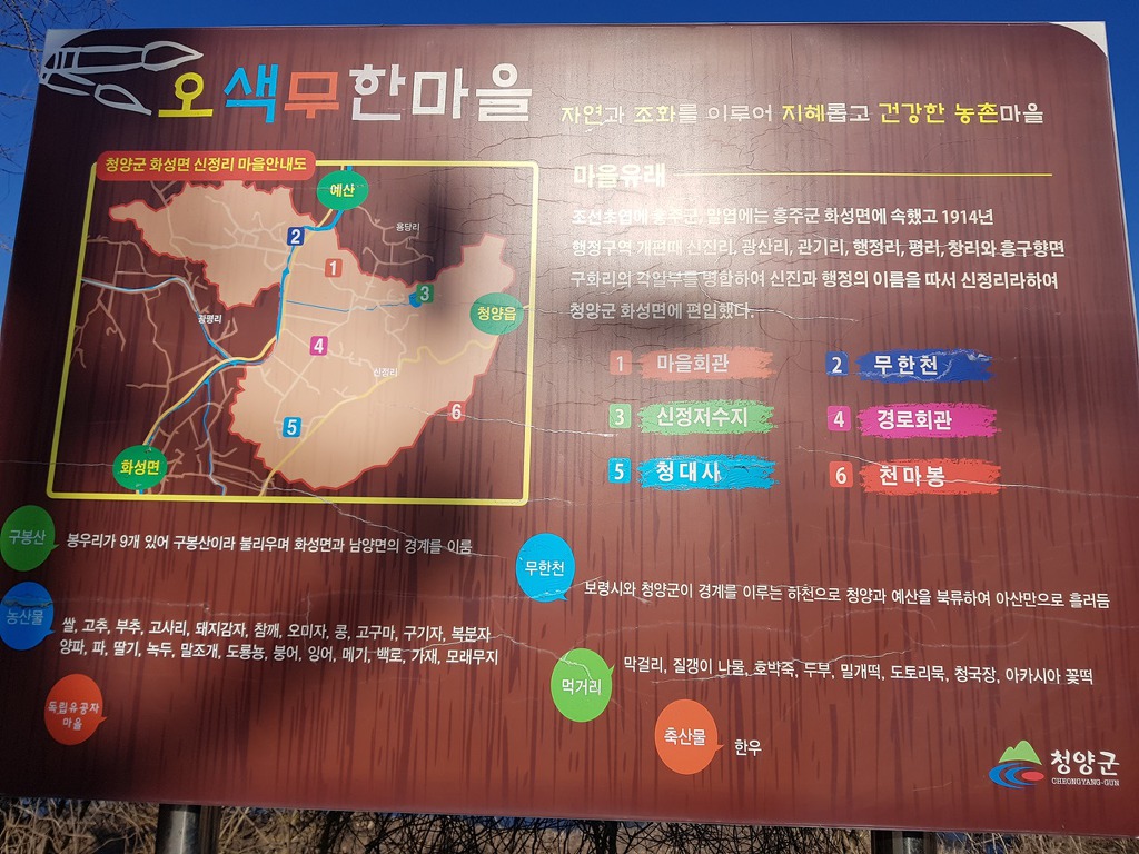 지천은 청양땅으로 흘러들어 꿈꾸는 백마강이 되었다가 한많은 700년 도읍지가 있던 부여로 흐른다.