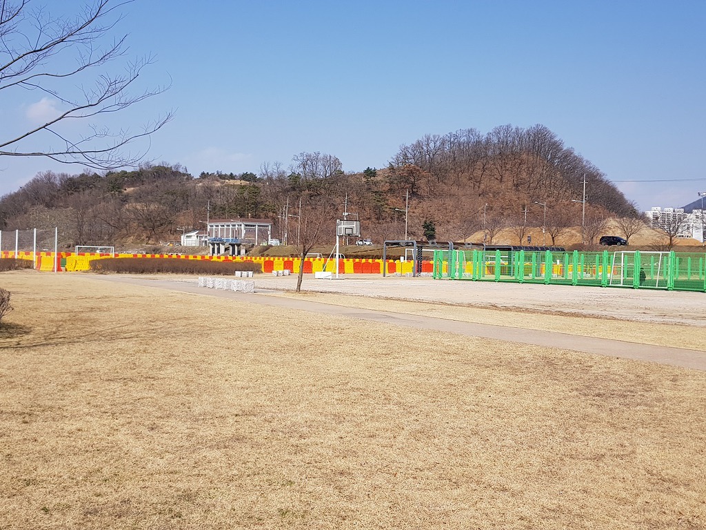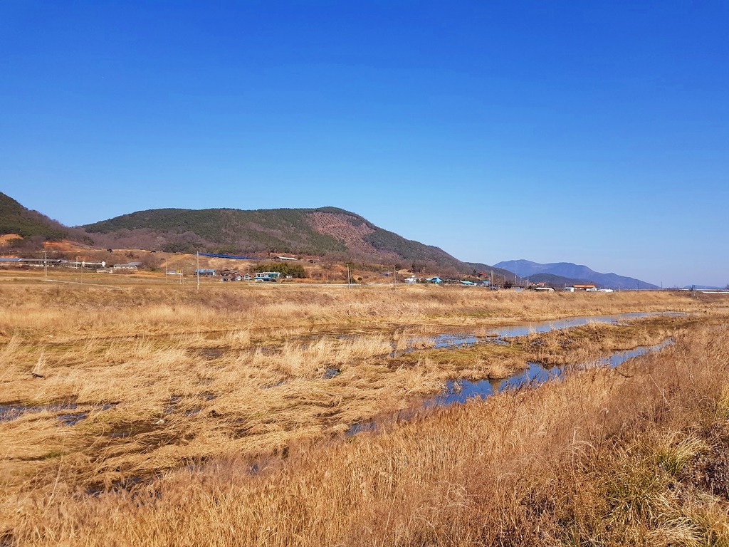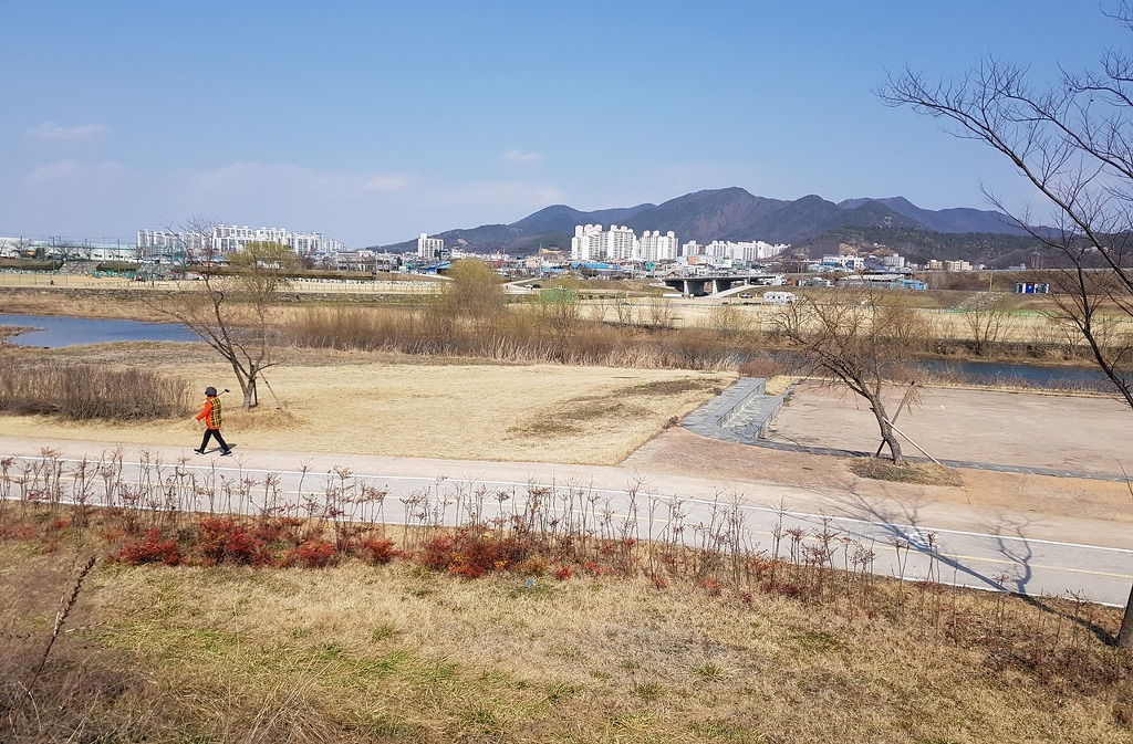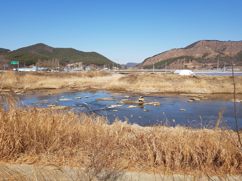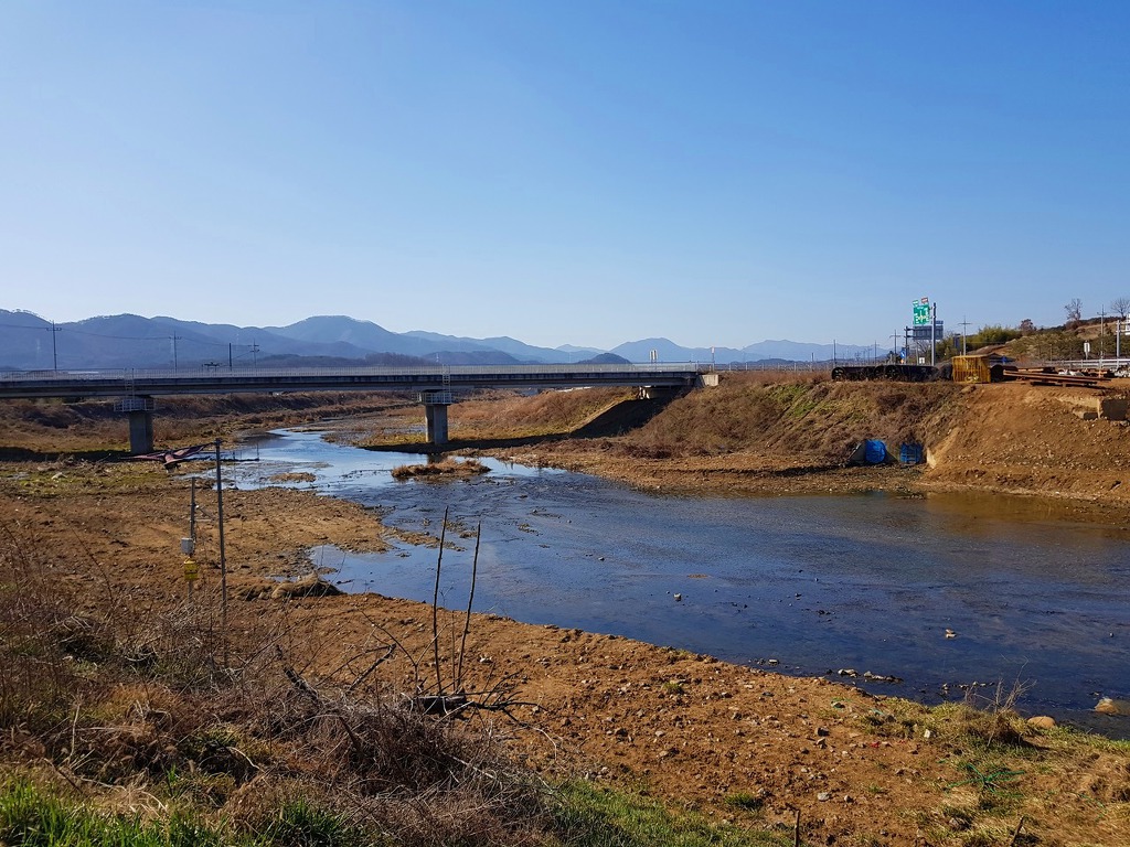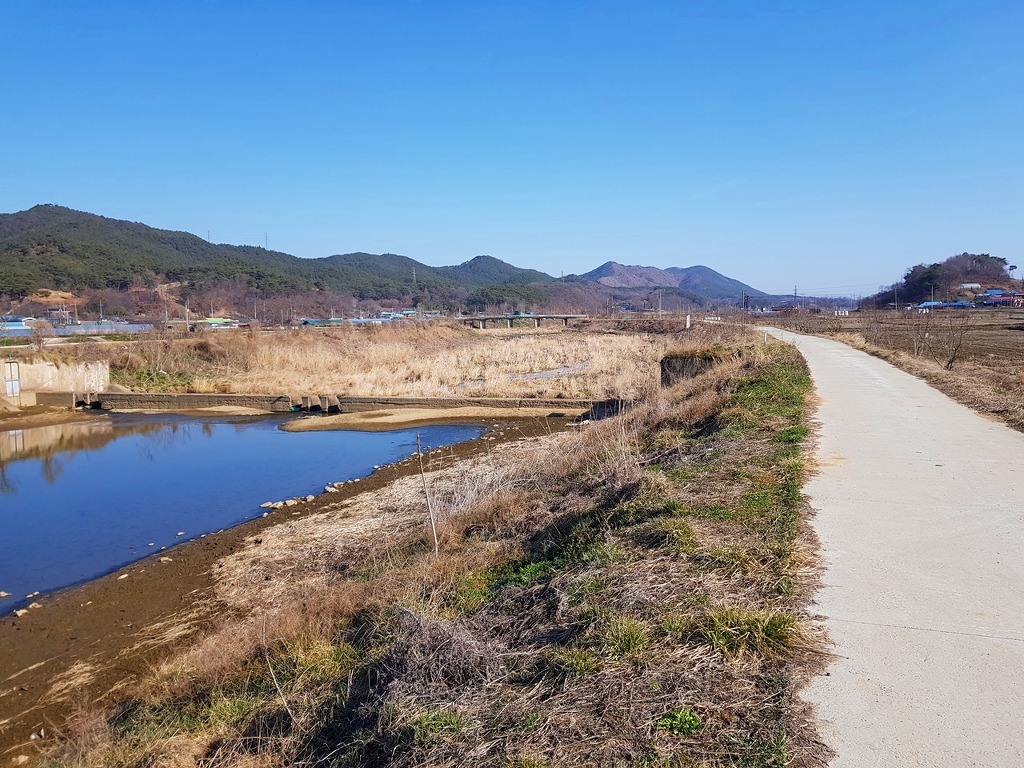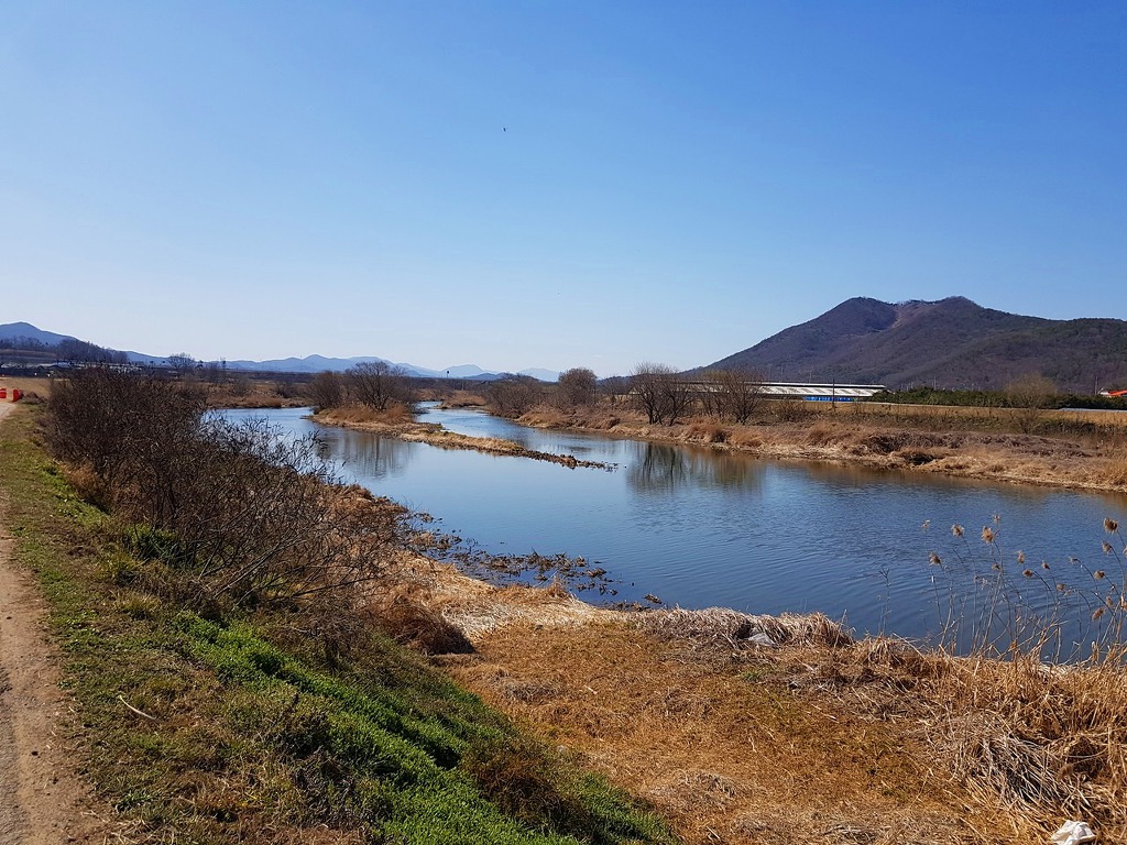이제 거의 끝나가니 멀리 아산땅의 영인산이 보인다. 이번달안으로 100대강중에 곡교천을 지난다며 현충사 앞을 지나 영인산 삼봉(三峰)을 올려다 볼 수 있을것 같다. 오늘은 이쯤에서 영인산 구경하는것으로 만족하고