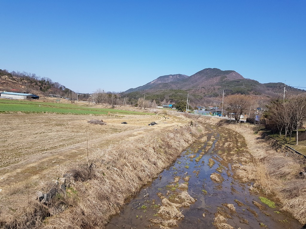 백월산에서 발원하는 무한천이 북쪽으로 치고 나가는곳으로 멀리 예당호 옆에 봉수산이 우뚝하다.
