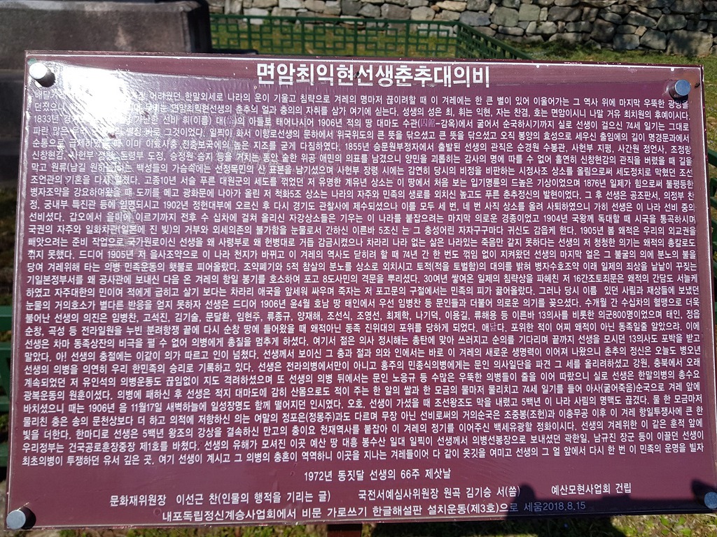 붉은 홍살문을 지나면 최익현 선생 묘소가 있다. 오는길에 맥주 한켄 사 가지고 왔으니 선생 묘소에 들러 배향하고 가야겠죠