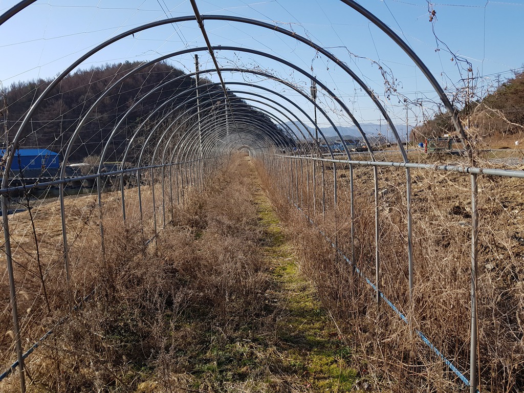 잡풀이 많아 둘레길은 아닌듯한데 하우스 골조를 이용해 뭔가 심은듯 보인다
