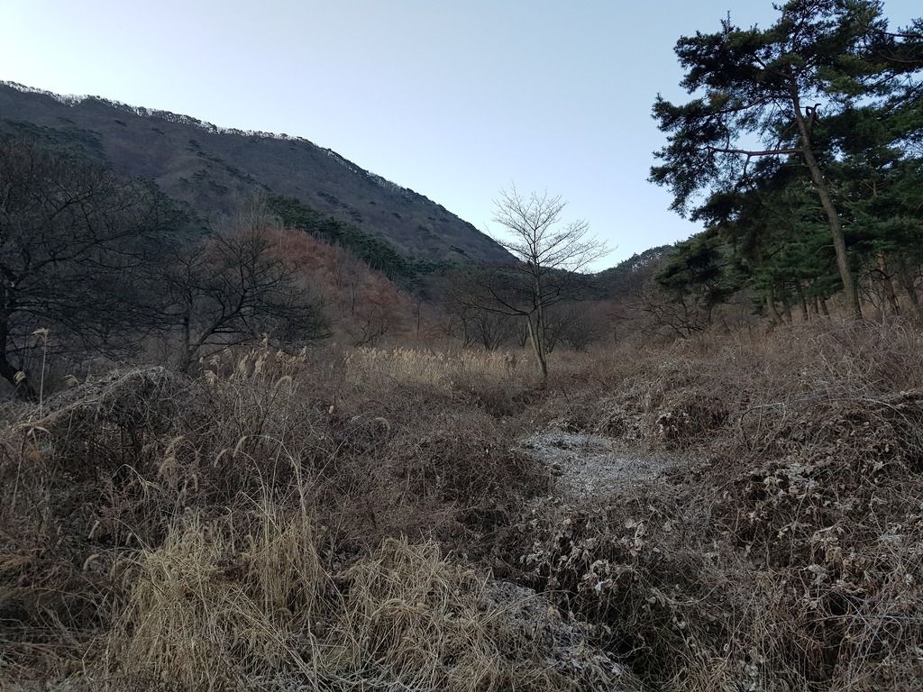 가운데 멀리 보이는 산은 이른 아침에 내려온 무한천 발원지가 있는 백월산이고 그옆에 성주산이 조금 보인다.