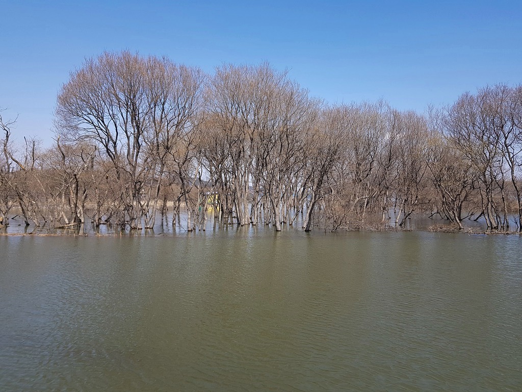 호수속으로 자란 느티나무 군락 잘살 수 있을까 하는 의문이 들지만