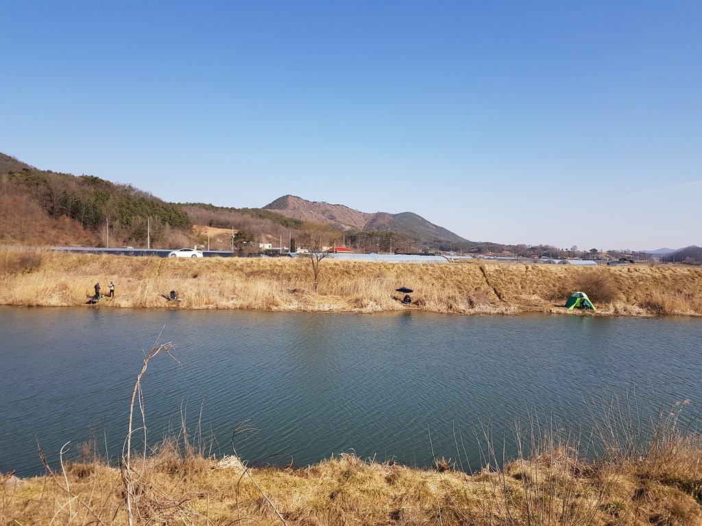 정자 저수지에서 본 가야할 길에 멀리 봉수산이 보이지만 점심때 저곳을 지날듯 바로 앞으로 양어장이 보이는데 도랑에서 붕어 삼매경에 빠진 낚시꾼 두분 손바닥 크기의 붕어 한수 잡으셨다. 산에 들면 산짐승, 물가에 가면 물고기 잡지않는 모습을 보려 하는데 물가에서는 낚시꾼들을 많이 만나다 보니 먹음직한 먹이에 현혹되지 말고 제발 잡히지 말라는 생각만 한다.