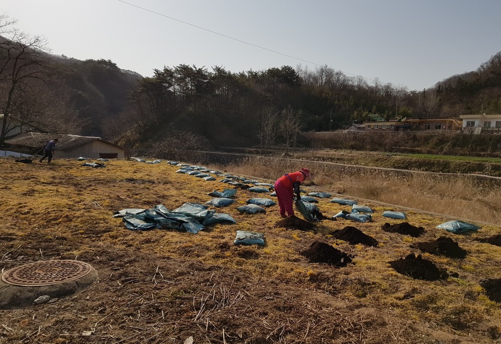부부 어르신이 밭에 거름포대기를 옮겨 거름을 뿌리는 중