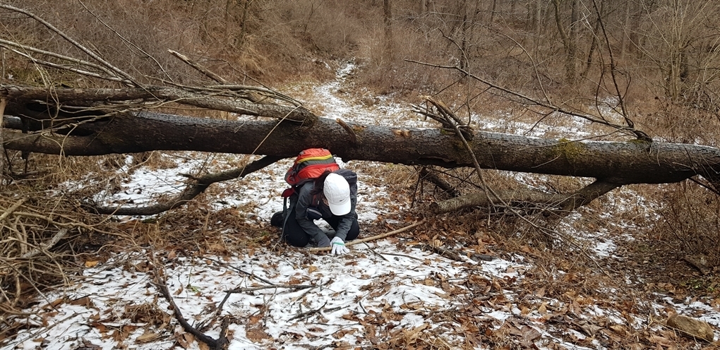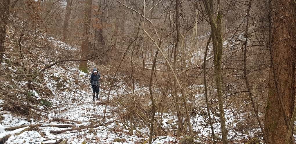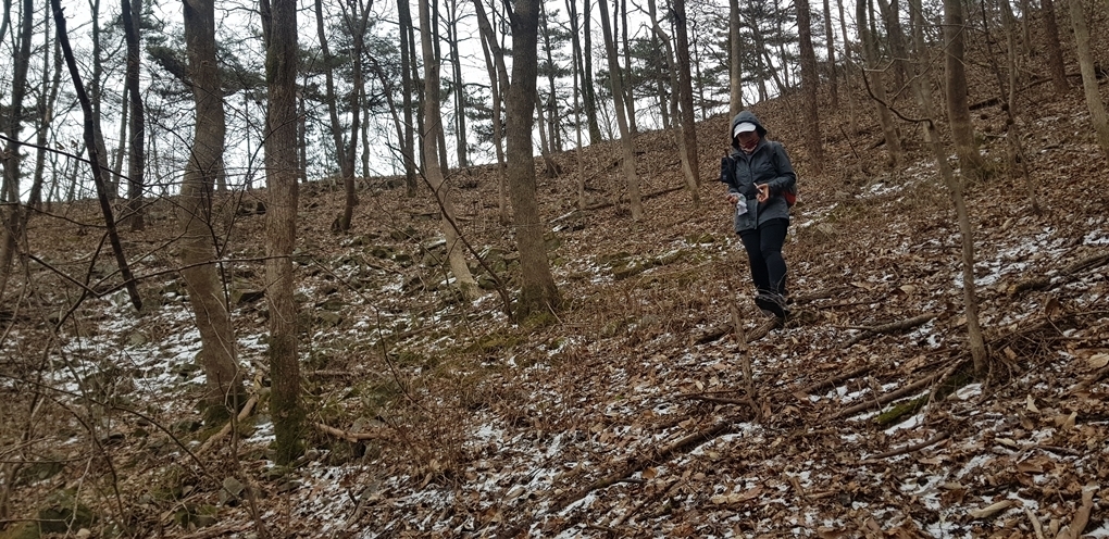 몇 년 전 태풍이 불어 전나무가 많이 쓸어져 있는 곳을 유격 훈련하듯 지나