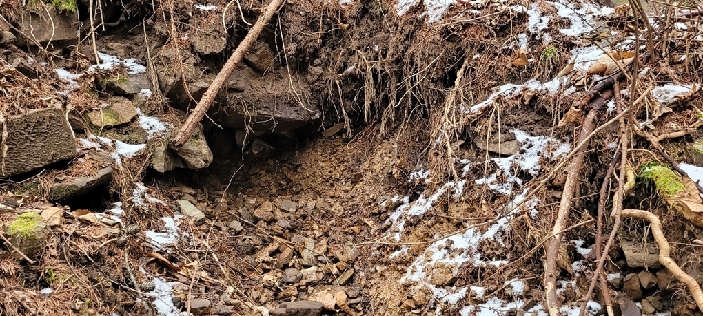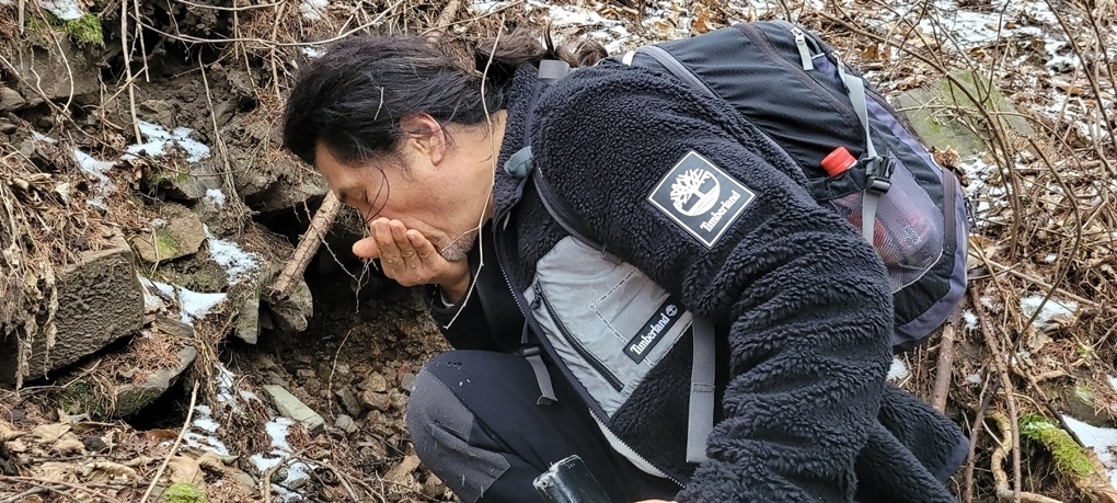 능선에서 100m 정도 내려와 계곡과 계곡이 만나는 부근의 돌 축대 아래 물이 흘러나오는 곳