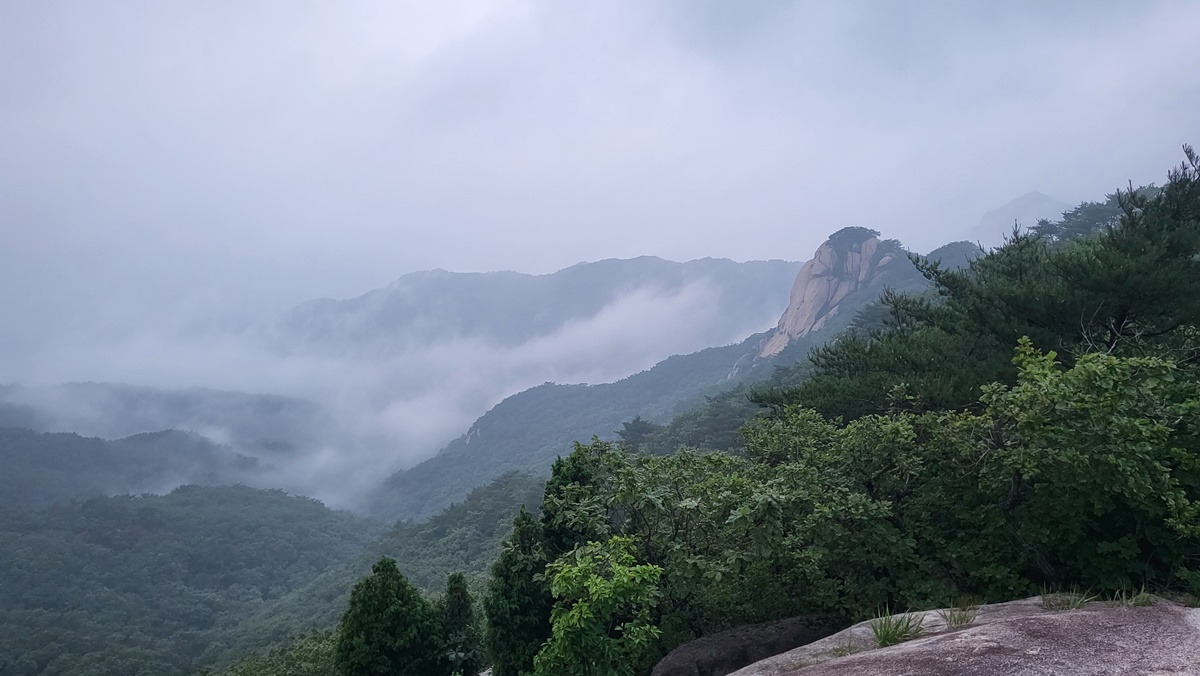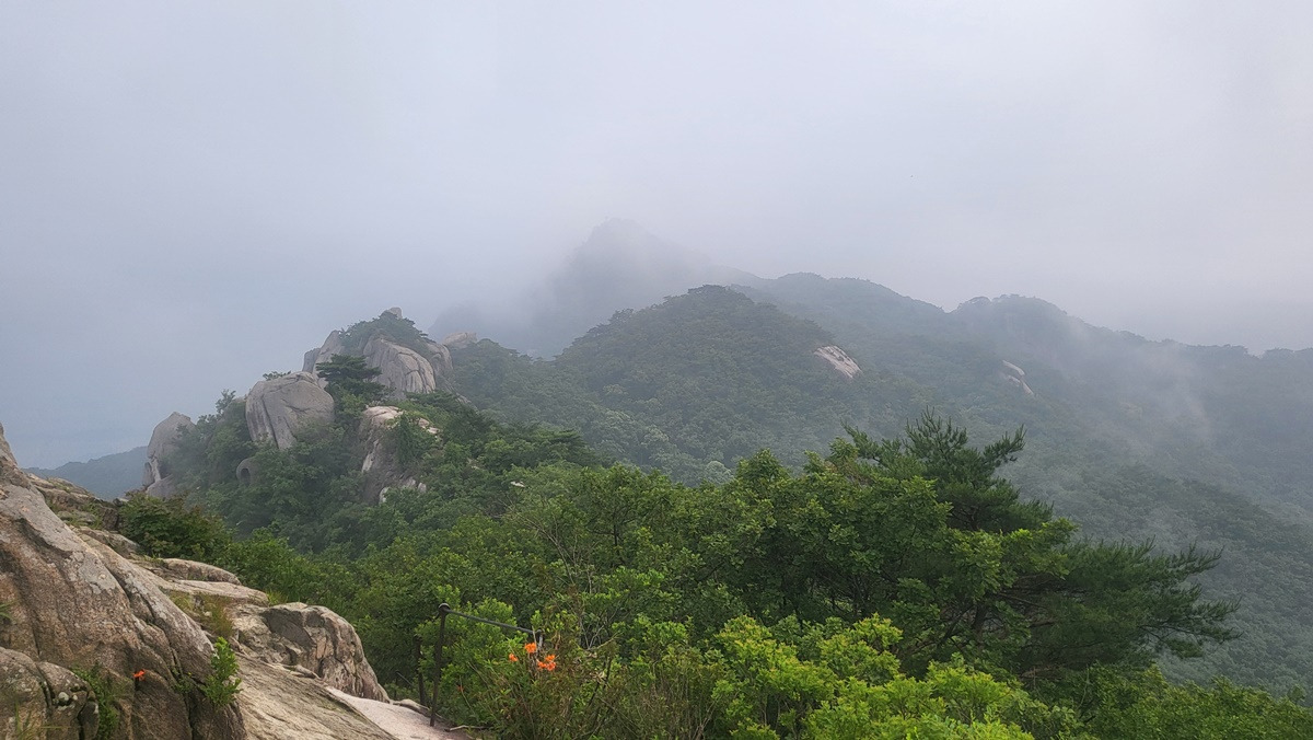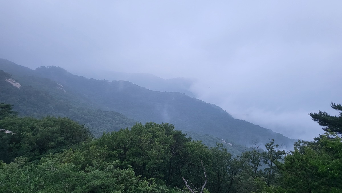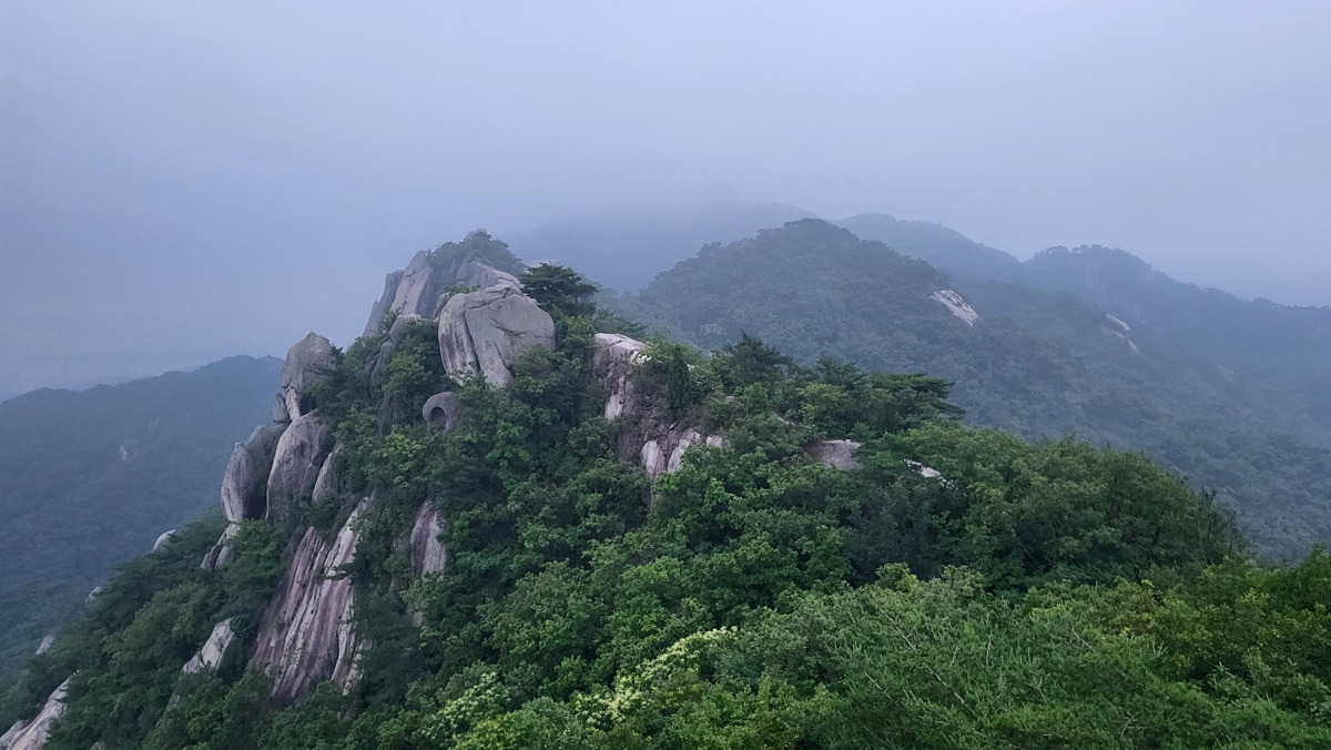 지난 구간 걸었던 임꺽정봉과 불곡산 상봉, 구름에 가려 있다.