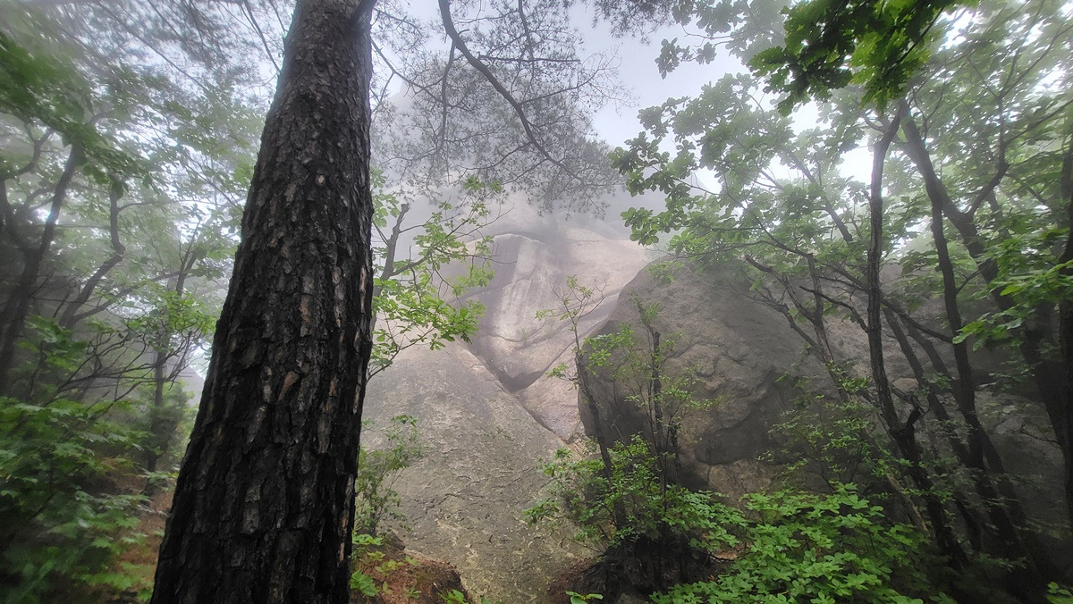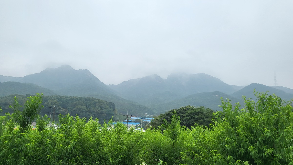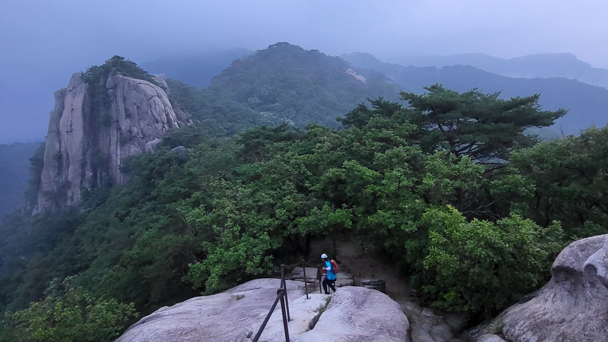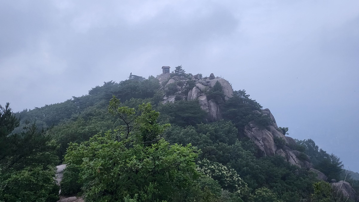 지난 구간 걸었던 임꺽정봉과 불곡산 상봉, 구름에 가려 있다.