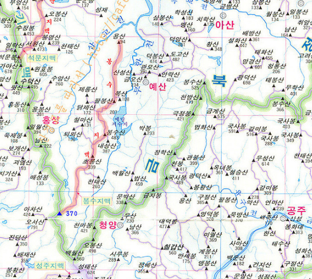 봉수지맥 우측의 무한천은 길이 53.9km, 유역면적 467.54㎢에 예산군 신암면이 종점이 된다.
