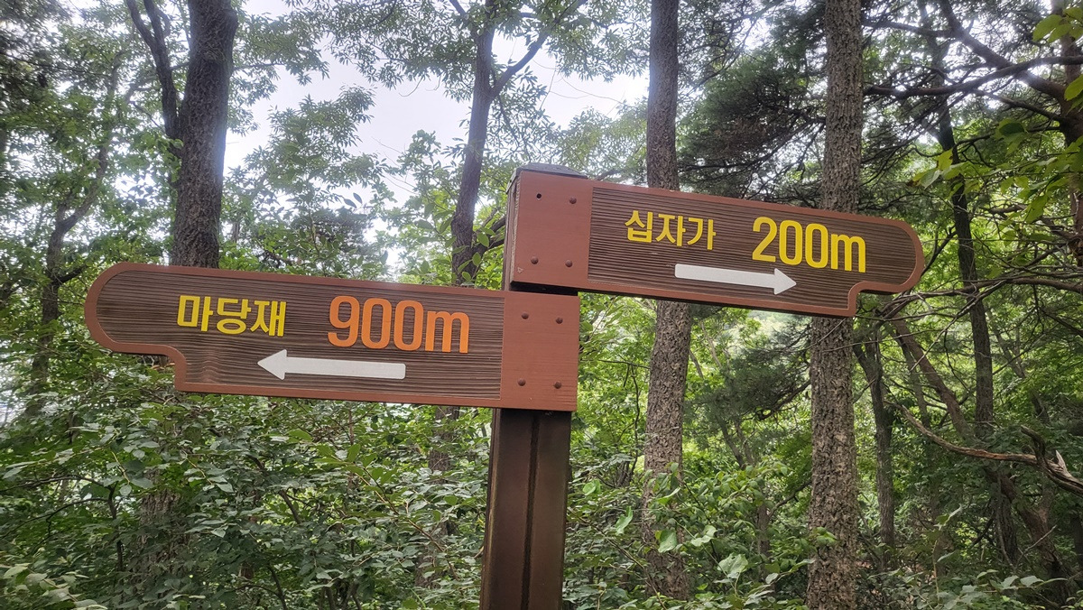 지나온 십자가봉과 마당재 이정표가 보이는데 마당재는 수리치골 순례길이다,