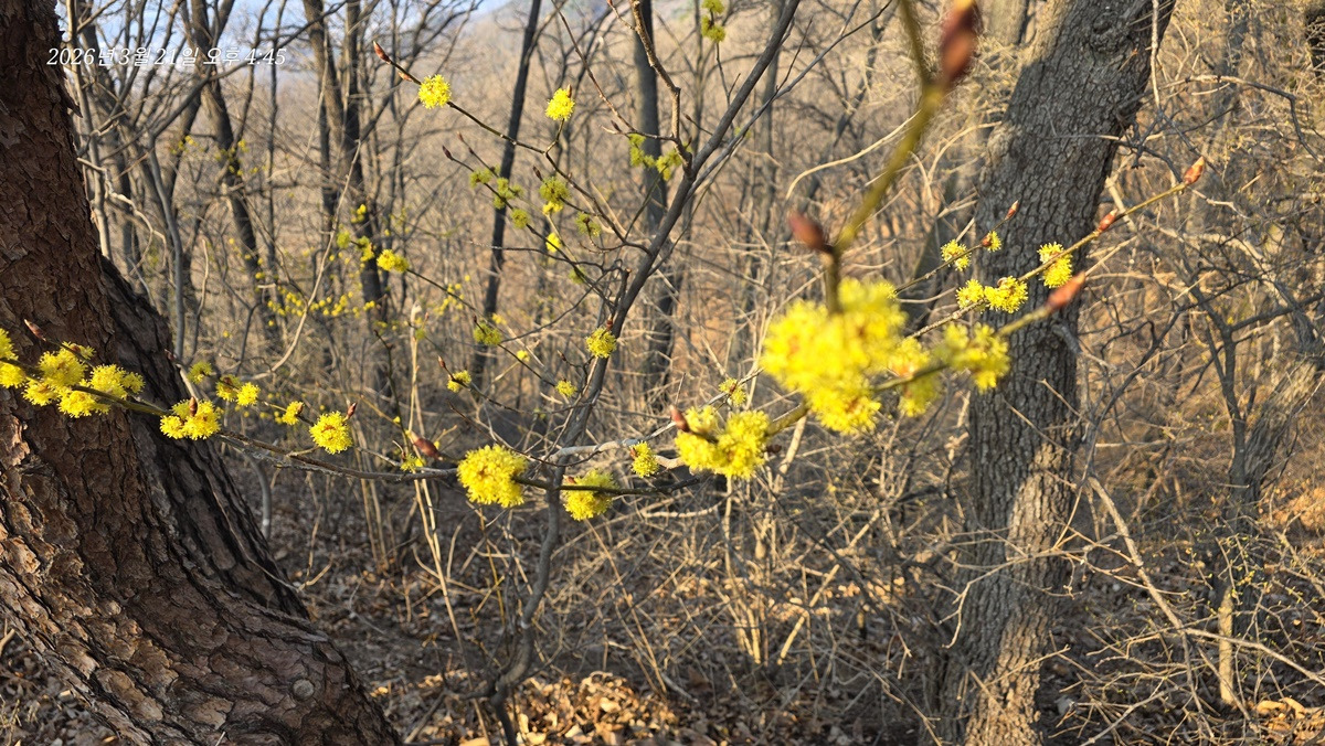 고성산 지나서 생강나무꽃이 등로에 만발하다.