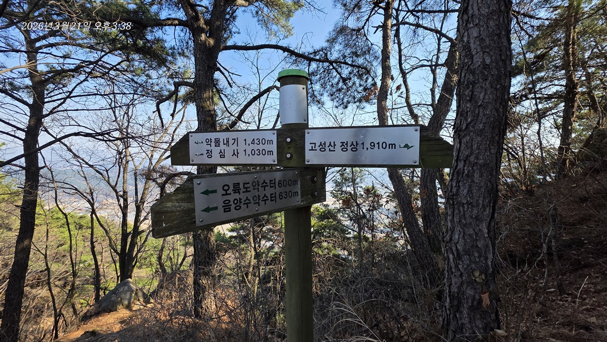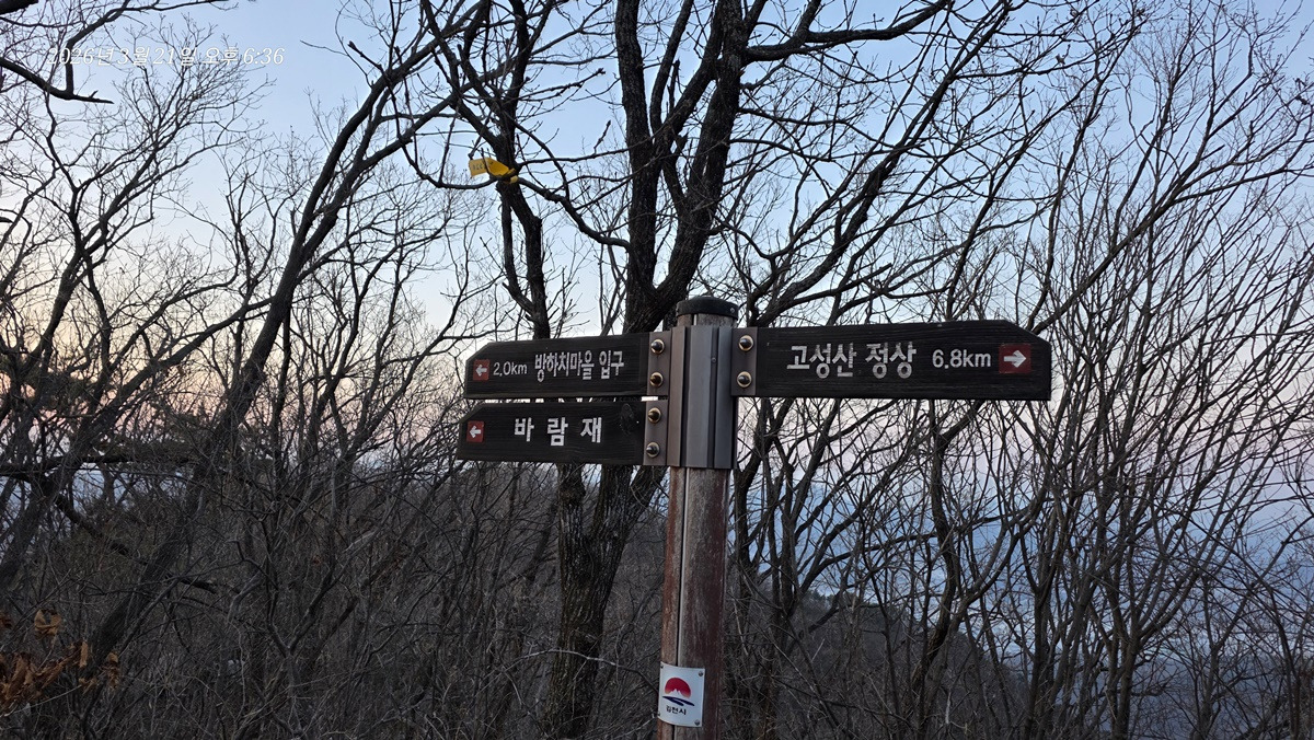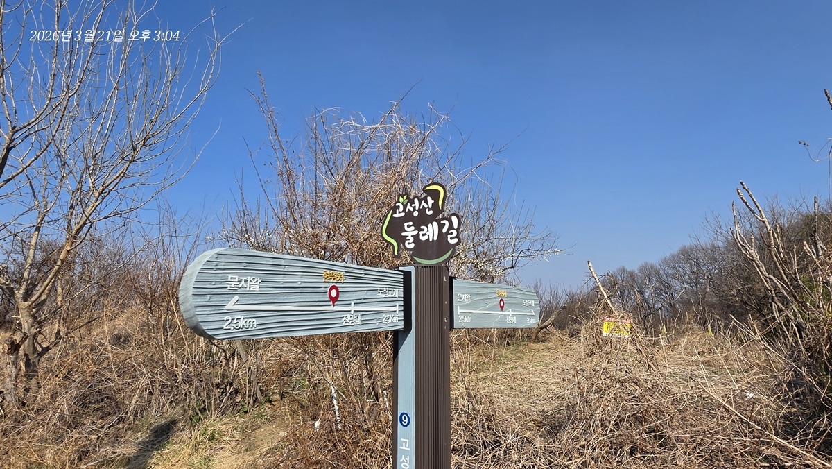 도서관에서 300m 정도 걸어가면 고성산둘레길 이정표가 보이고 이정표 따라 가면 된다.