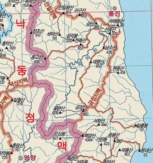 근남면 망양해수욕장에서 동해바다로 그 맥을 다하는 도상거리 38.4km의 산줄기이다.