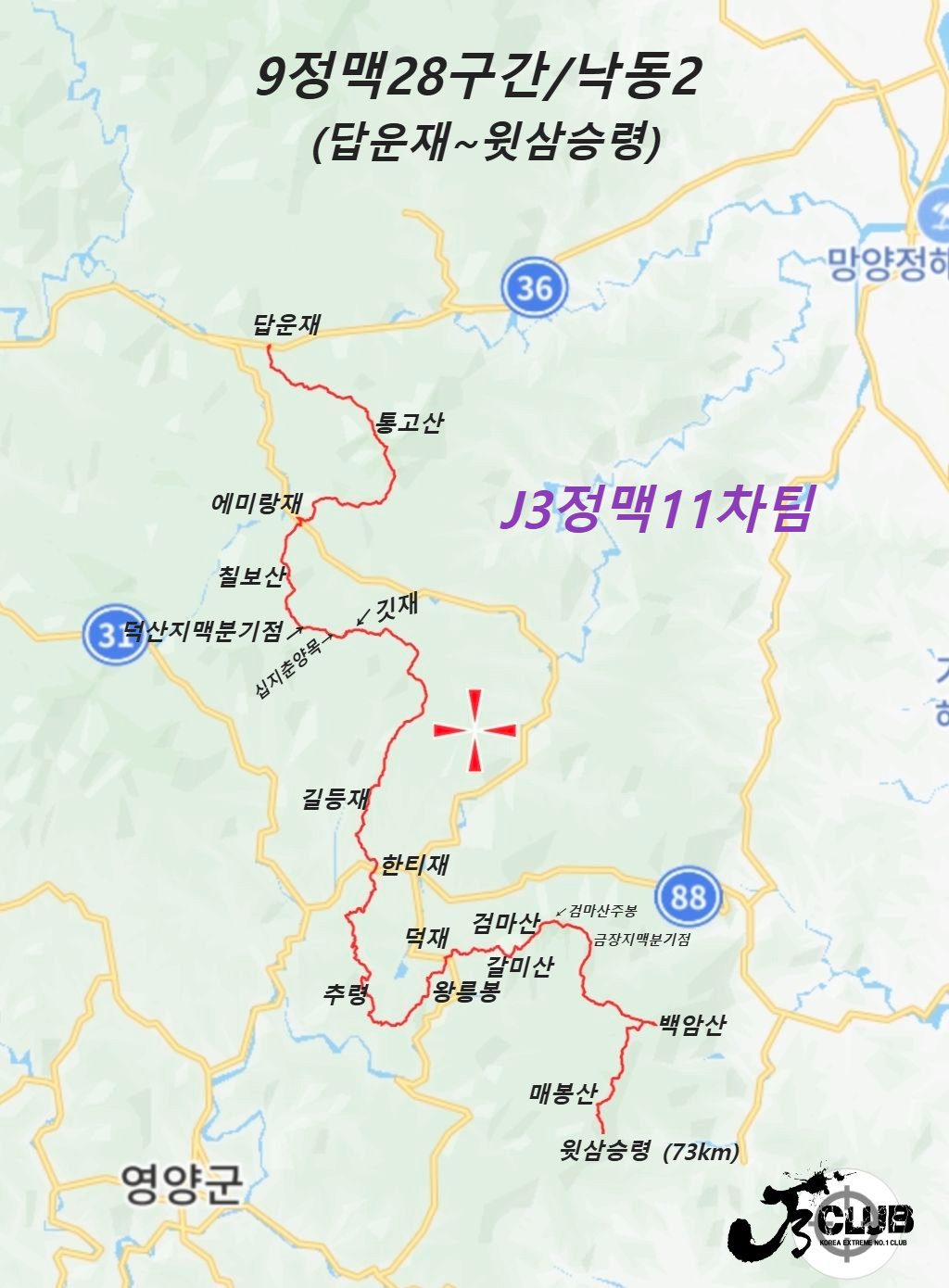 ~우천재~●추령~●왕릉봉~덕재(☆)~갈미산~●검마산~검마산주봉~금장지맥분기점~●백암산(울진)~매봉산(919봉)~●윗삼승령