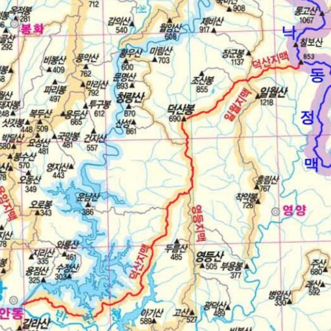답운재~●통고산~애미랑재(☆)~●칠보산(영양)~새신고개~덕산지맥분기점~십지춘양목~●깃재~●길등재~한티재(☆)