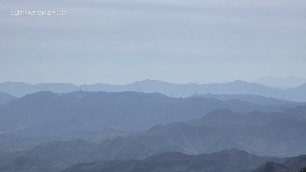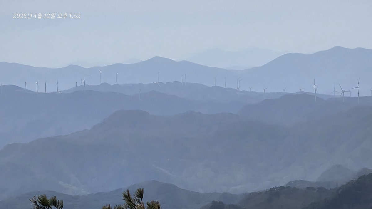 칠보지맥의 칠보산 그리고 우측멀리 영덕풍력단지 바람개비가 살랑거립니다.