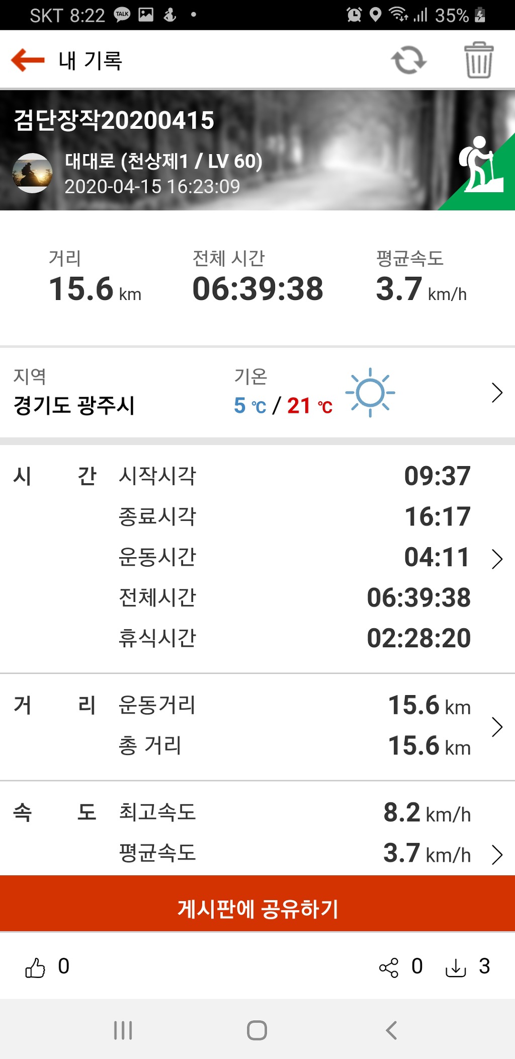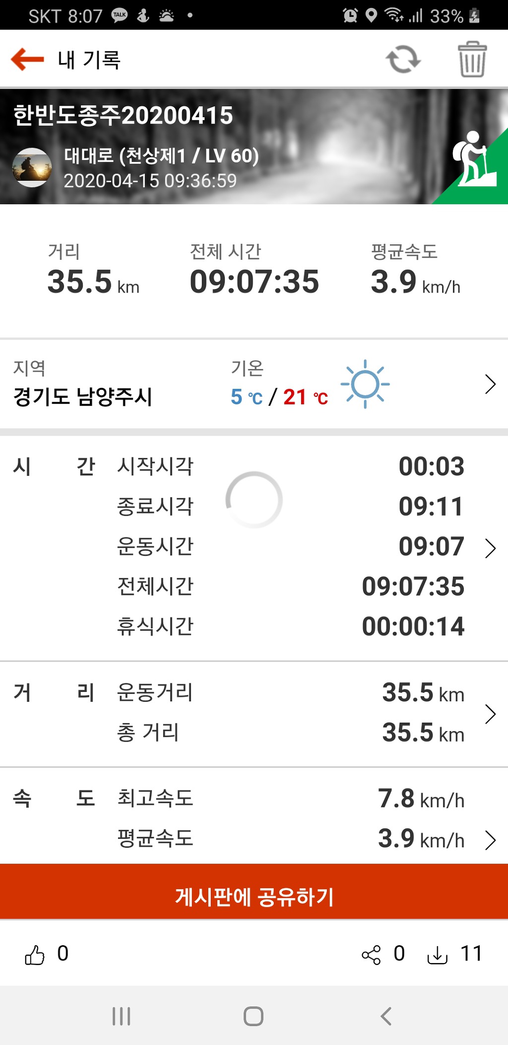3.산행거리 : 한반도종주 약35.5km(트랭글기준)