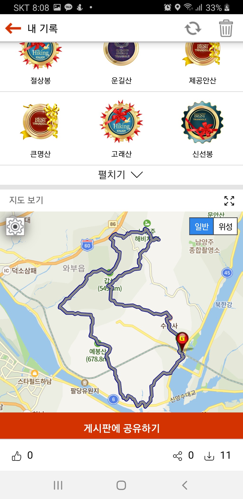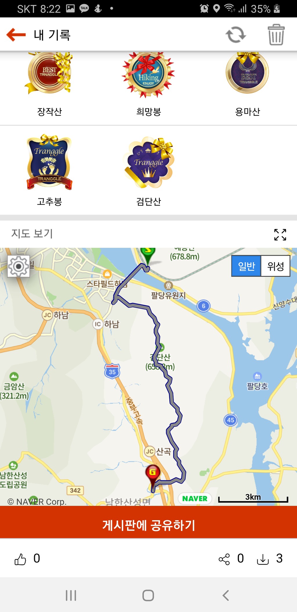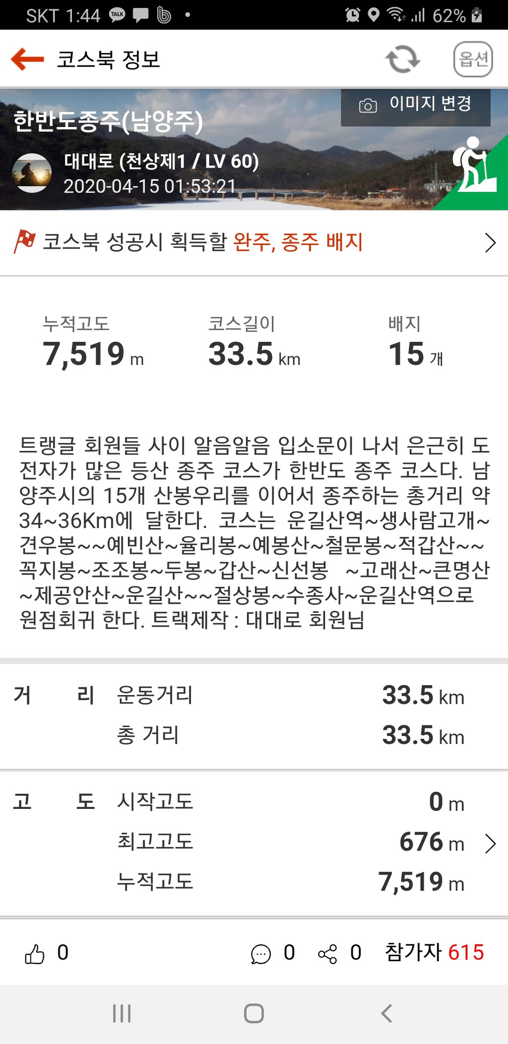 수도권산악회 검단장작 산행에 참석하기 위해 트랭글 코스북에 한반도종주 배지가 올라간 후 종주산행을 하고