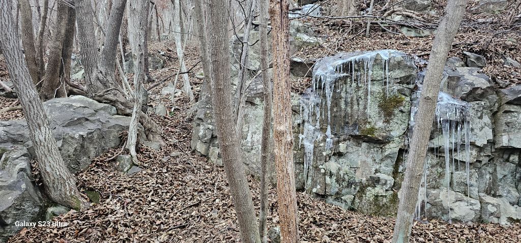 바위에서 흘러내린 물이 얼어 고드름이 생겼네요