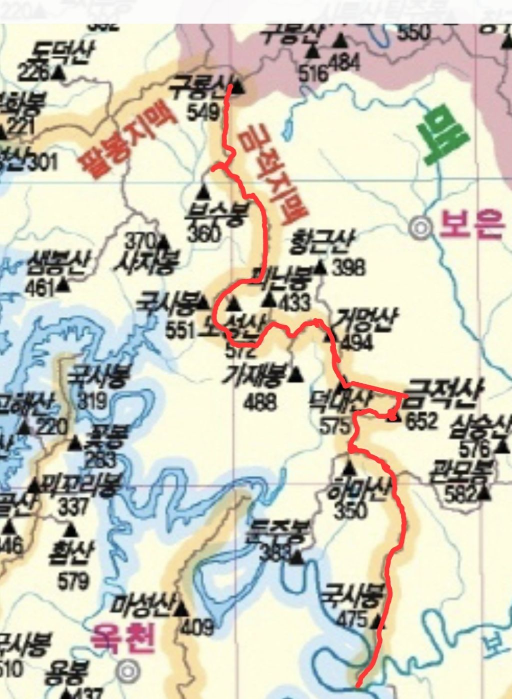 그 맥을 다하는 도상거리 49.6 km 되는 산줄기 인데, 보청천(報靑川 길이 69.3km)의 좌측 분수령이 된다.