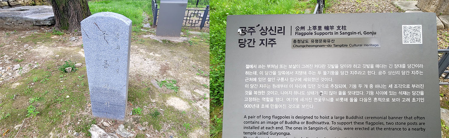 | ※ 불교의 주요 건조물 중 하나로 절에 법회 등의 행사가 있을 때 입구에 당(幢)이라는 긴 깃발을 걸어두는데 이 깃발을 걸어두는 길쭉한 장대를 당간(幢竿)이라고 하며 당간을 양쪽에서 고정, 지탱하는 기둥 2개를 당간지주(幢竿支柱)라 합니다. |