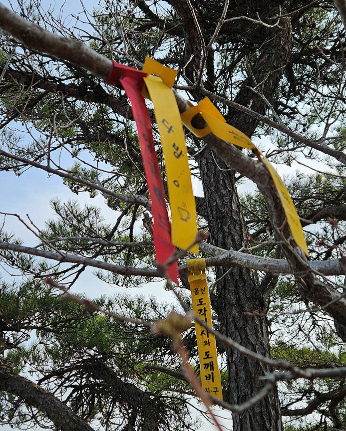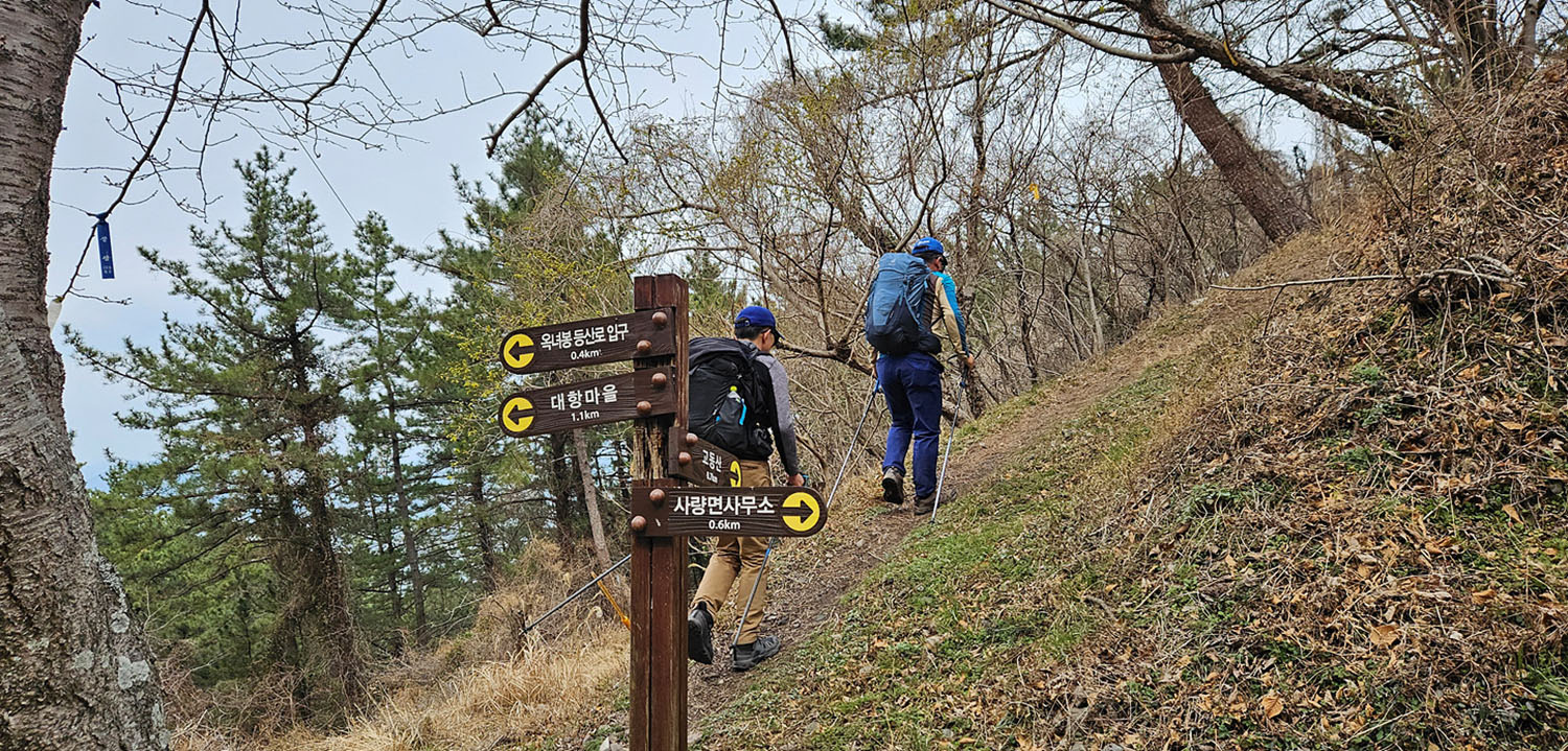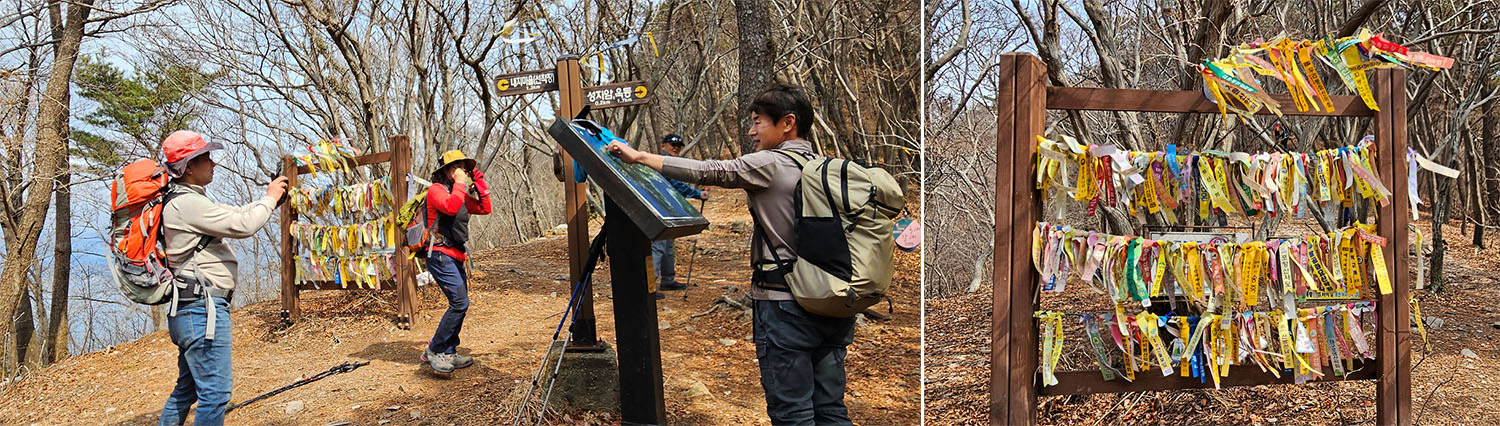 이정표와 덕지덕지 붙어 있는 산행 띠지들