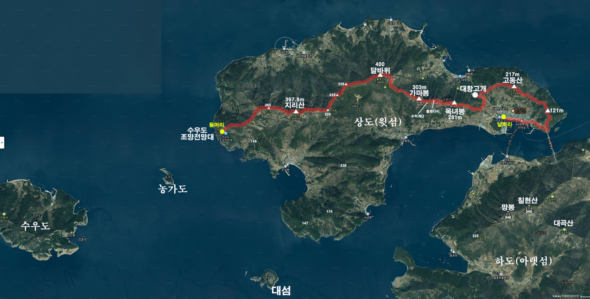 수우도조망전망대-365m-지리산(397.8m)-촛대봉(370m)-329m-336m-