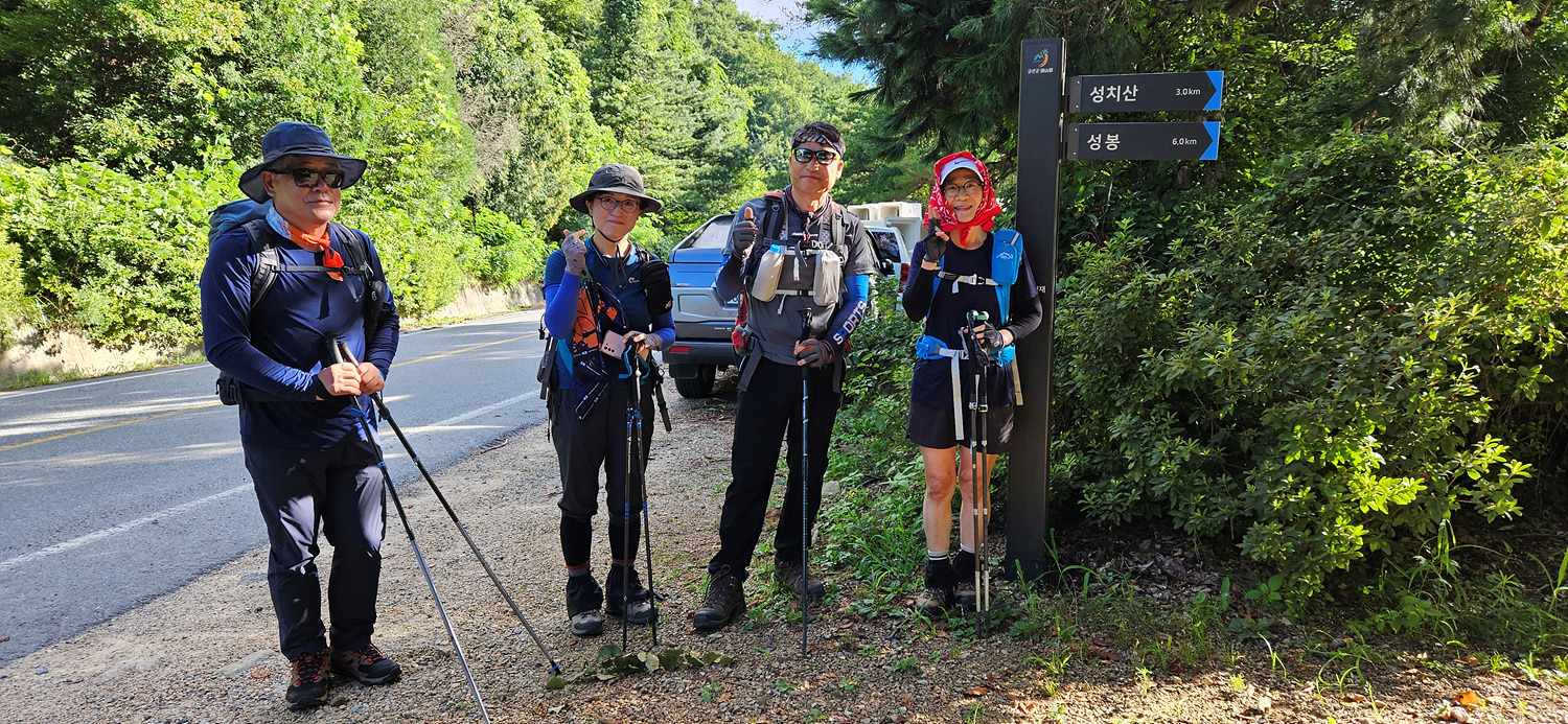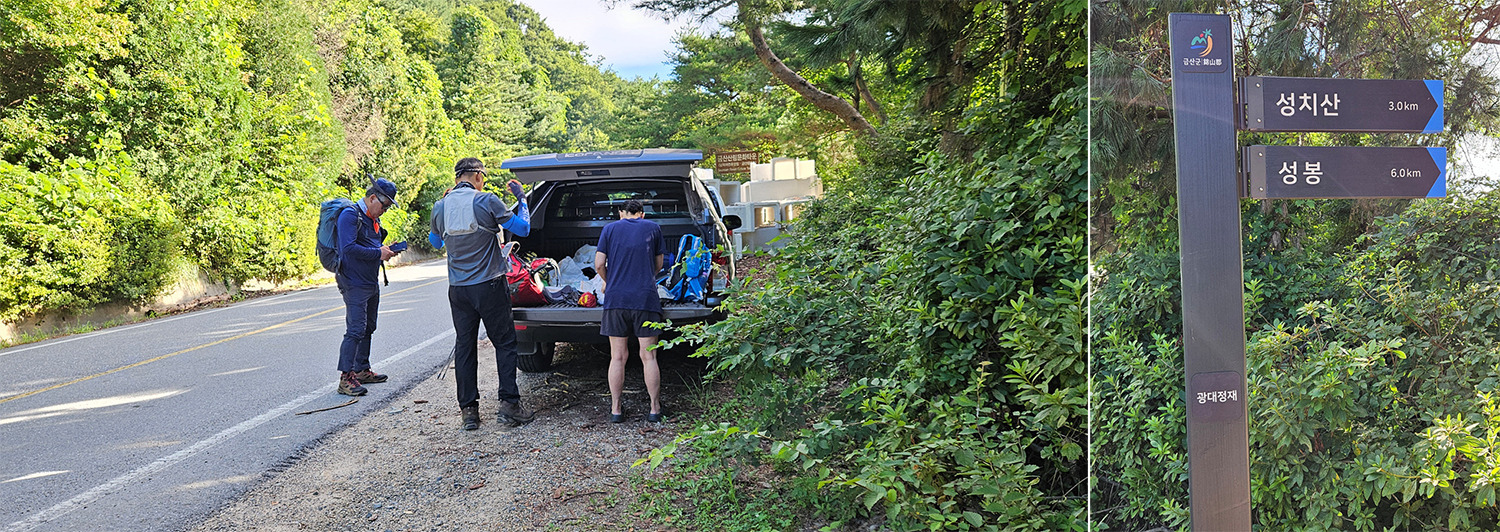 제 차 한 대는 날머리인 성치산휴게소 앞 주차장에 세워두고 들머리로 이동.