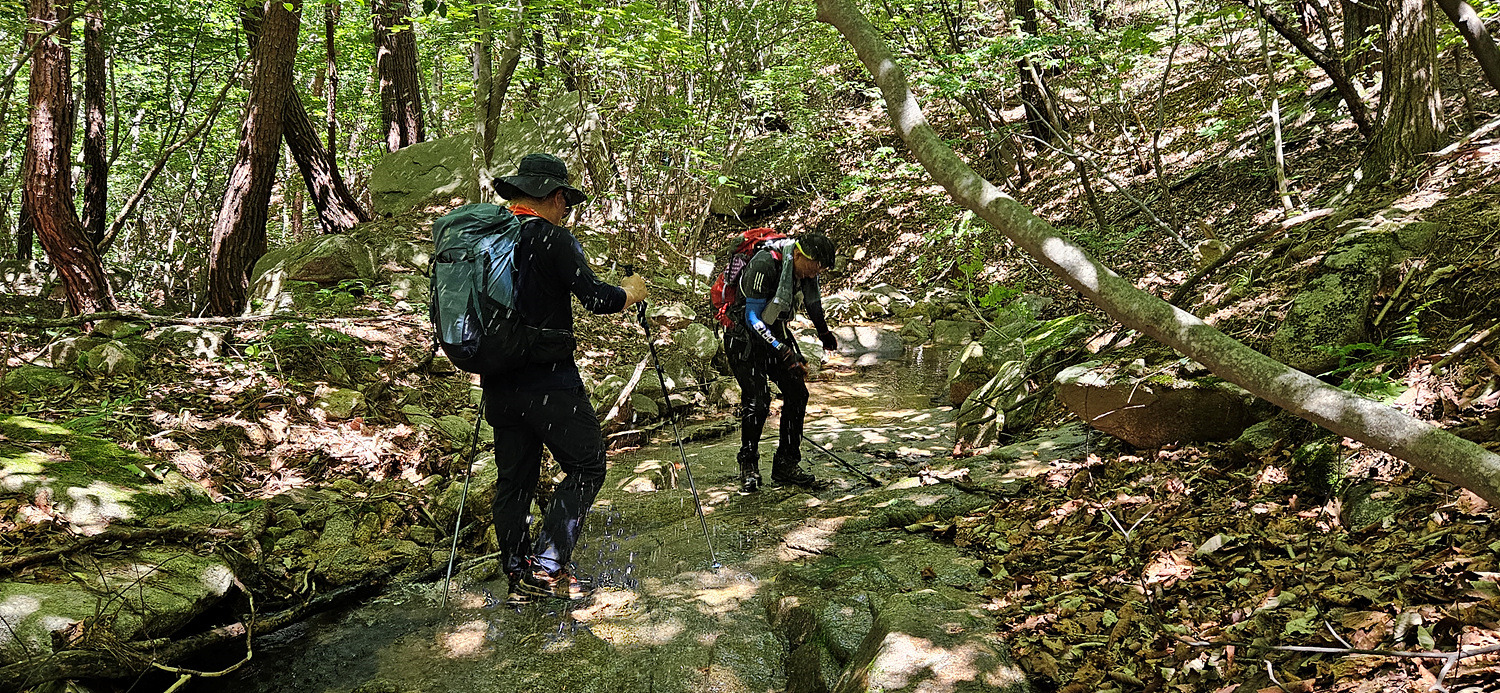 이번 걷는 구간 산 능선 양쪽으로 흘러내리는 물은