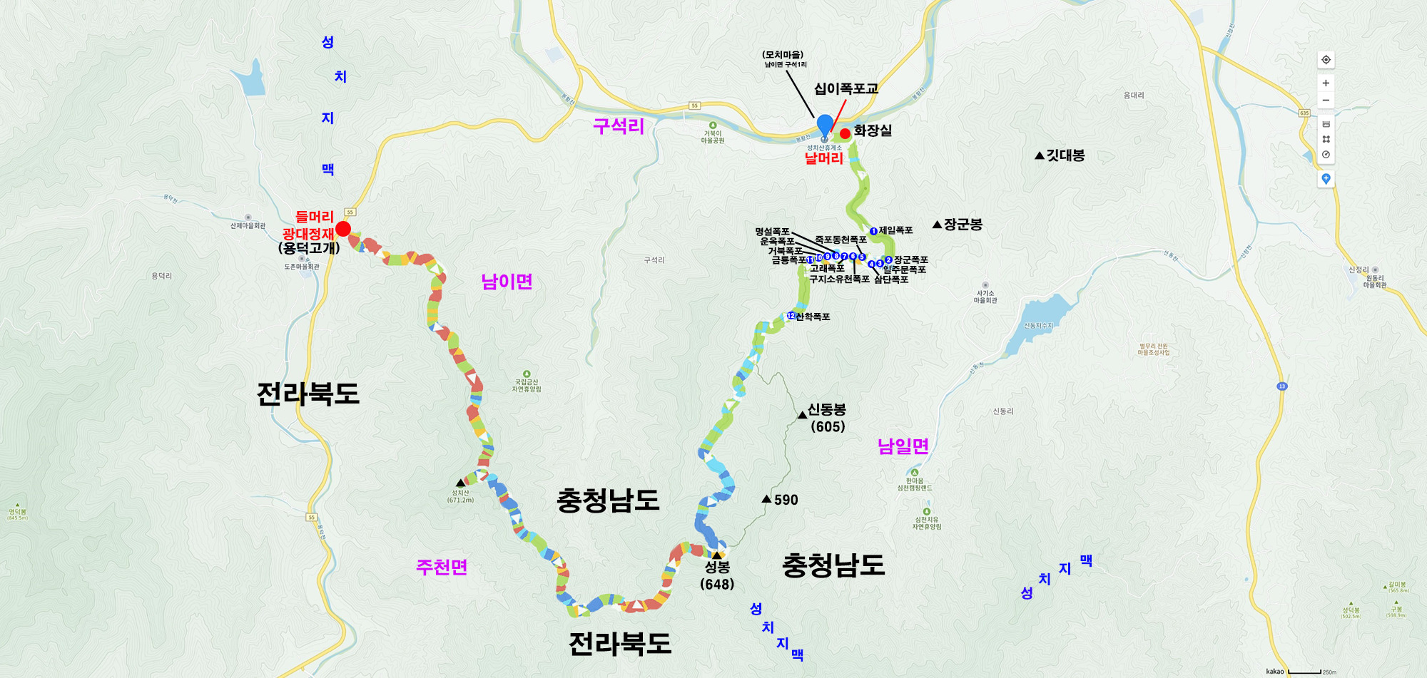 용덕고개(광대정재)-성치산(671.2m)-성봉(648m)-계곡길 하산 트레킹(십이폭포)-성치산휴게소