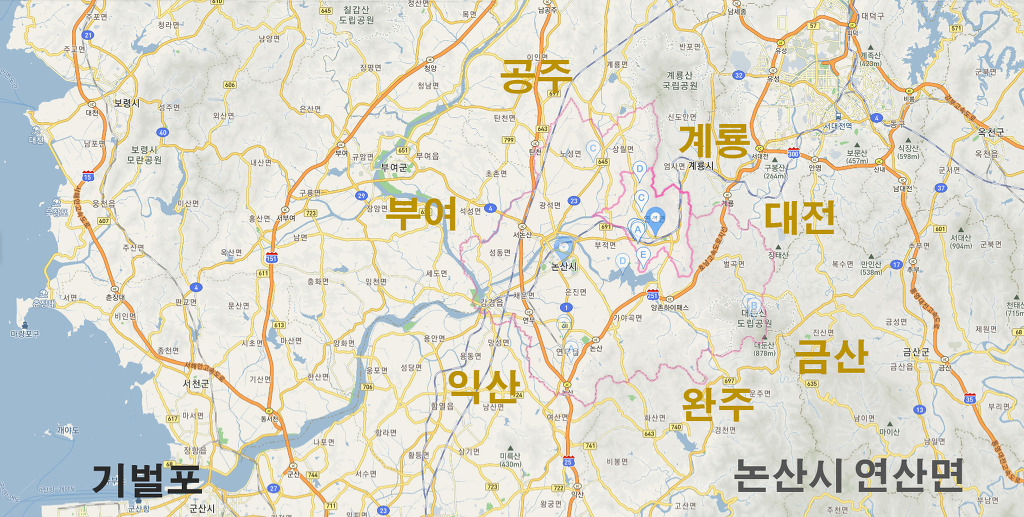 논산시의 연무대(연무읍, 논산시의 남쪽)와 연산(논산시의 북동쪽)도