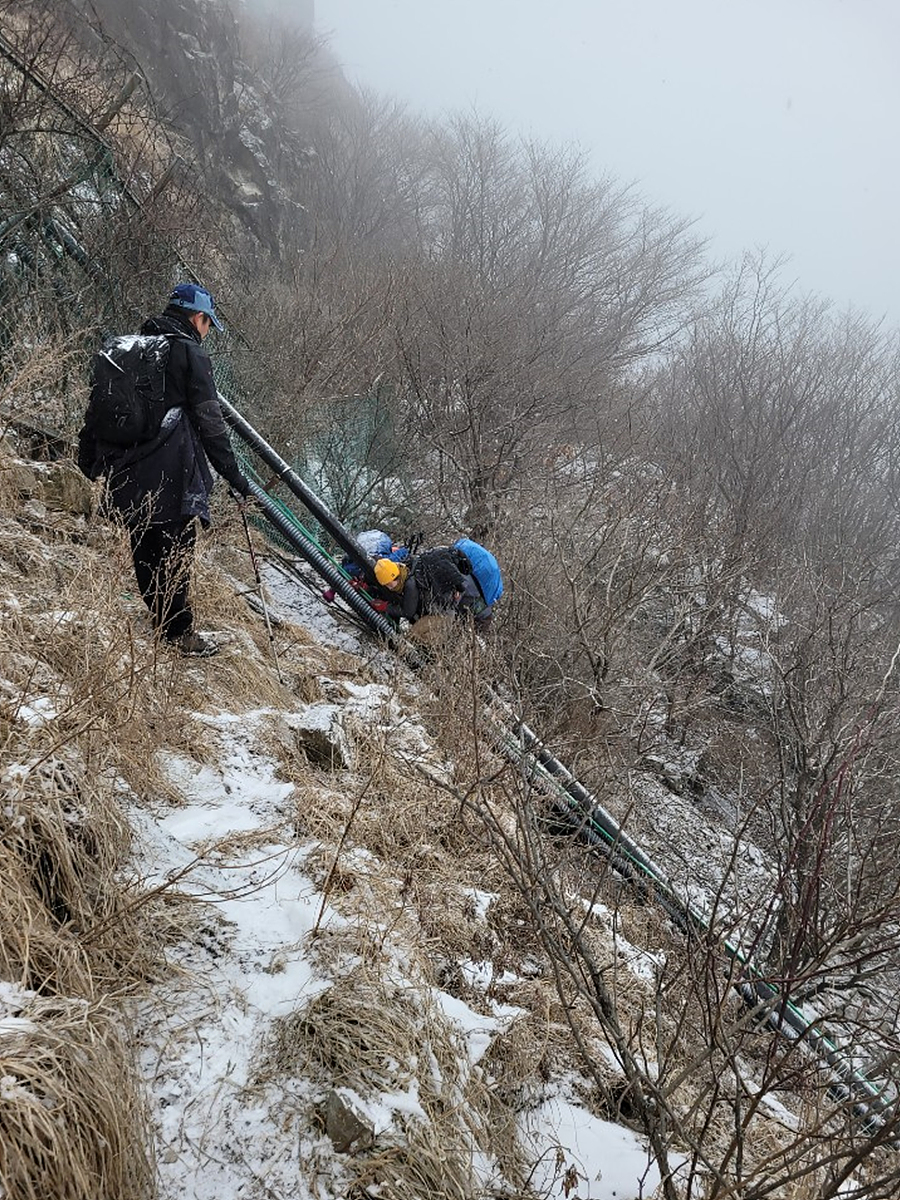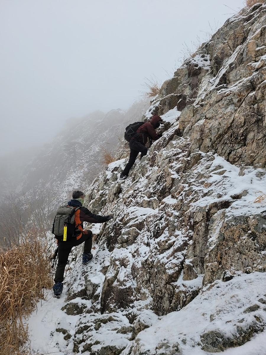 이런 날씨에 이런 암벽길 산행을 나온 우리들