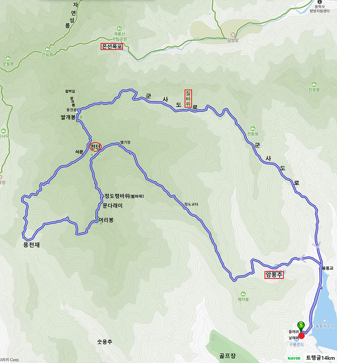 용천재-천단 인근-석문-쌀개봉-통천문-질바위-군사도로-