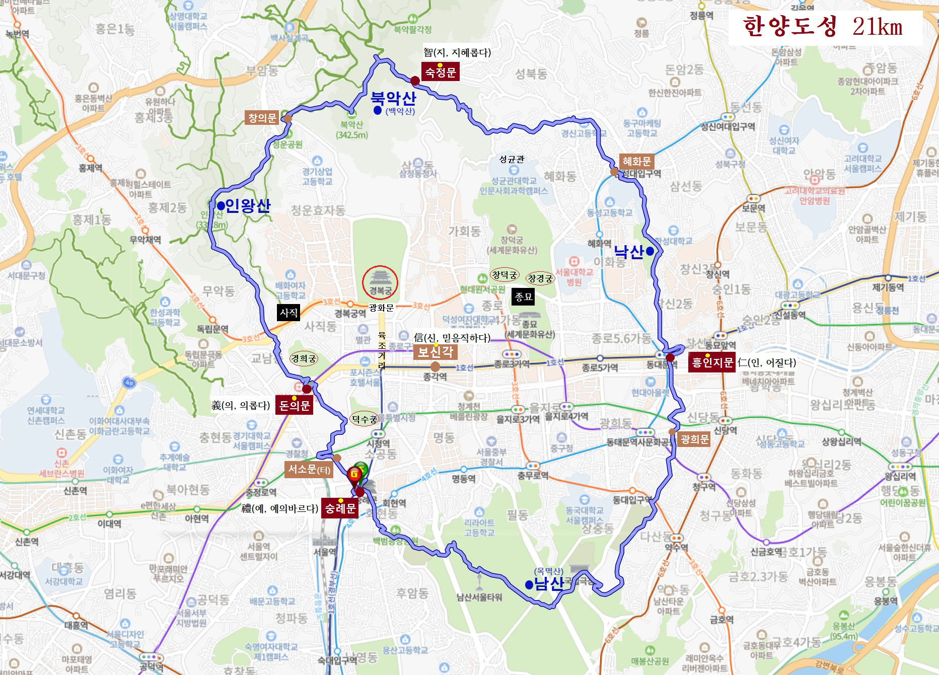 백악산(북악산)-낙타(낙산)-목멱산(남산)-인왕산 능선을 따라