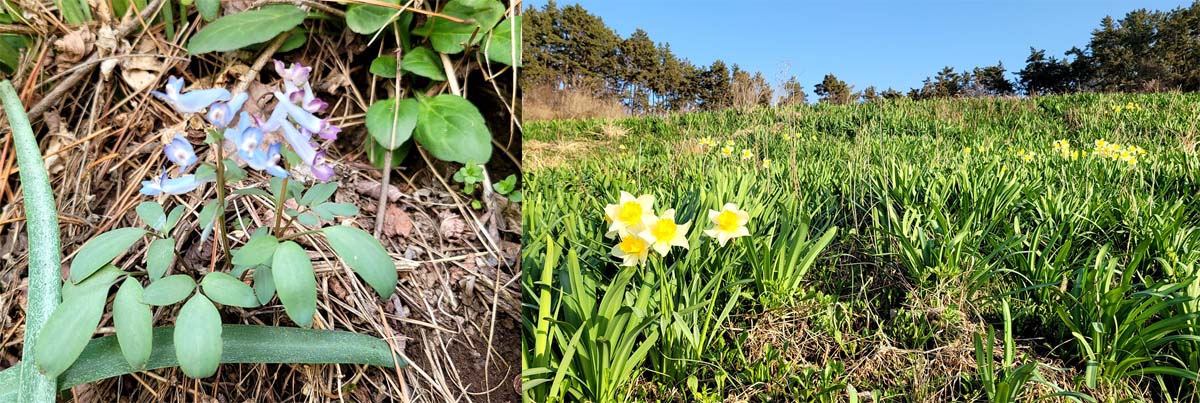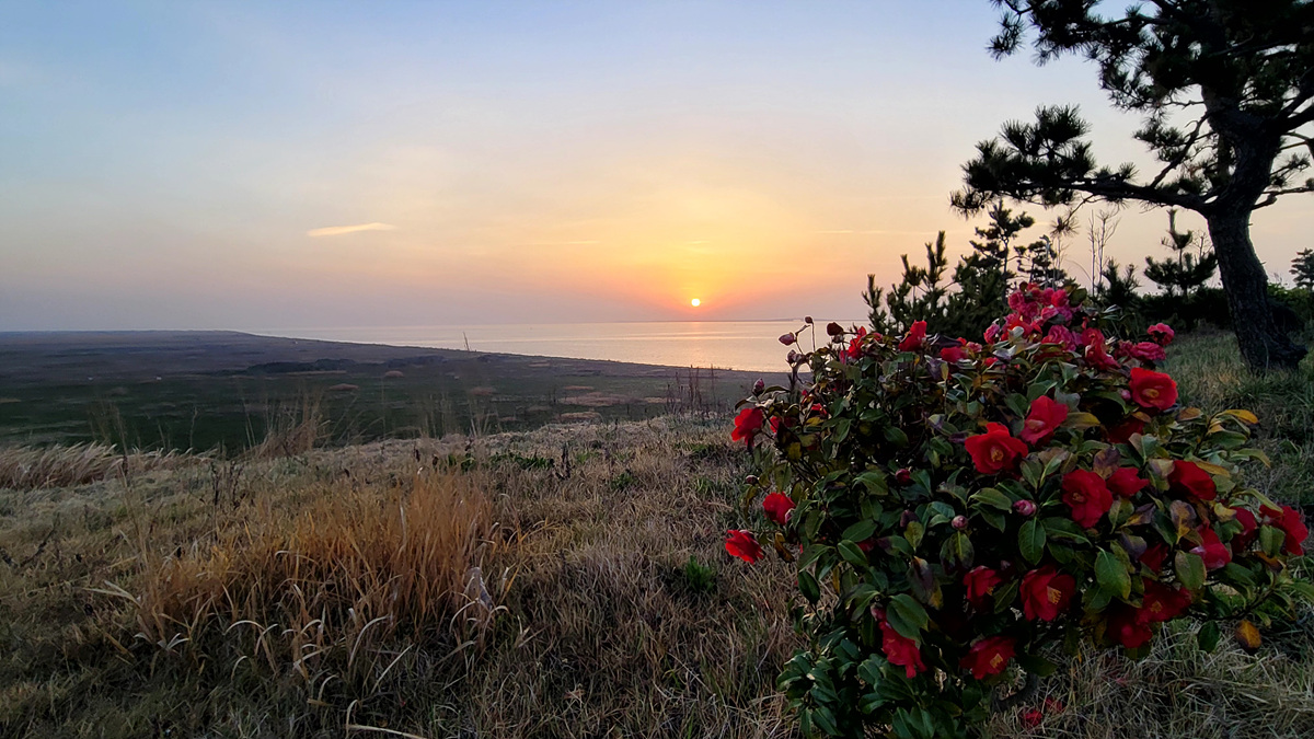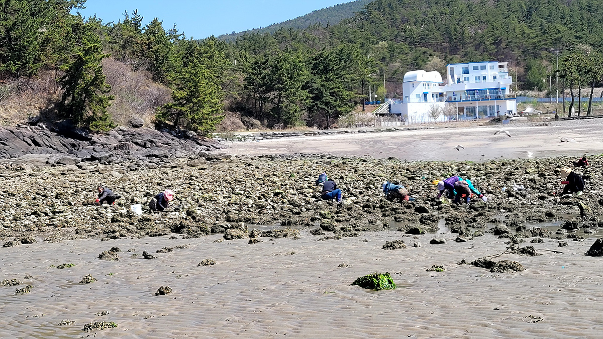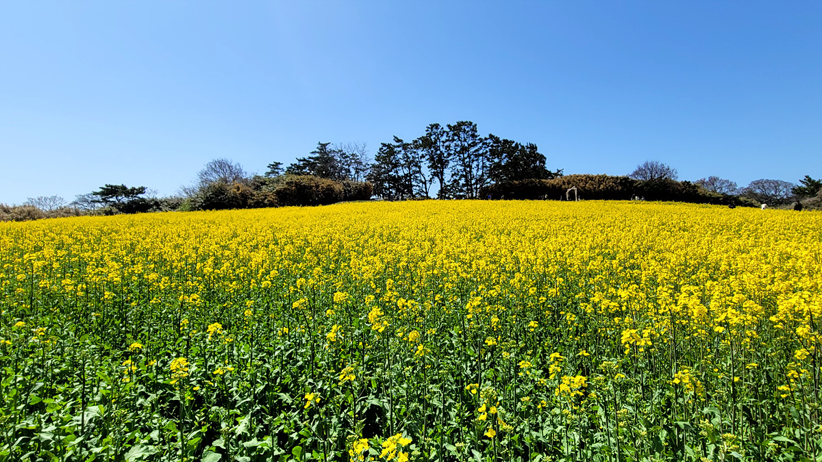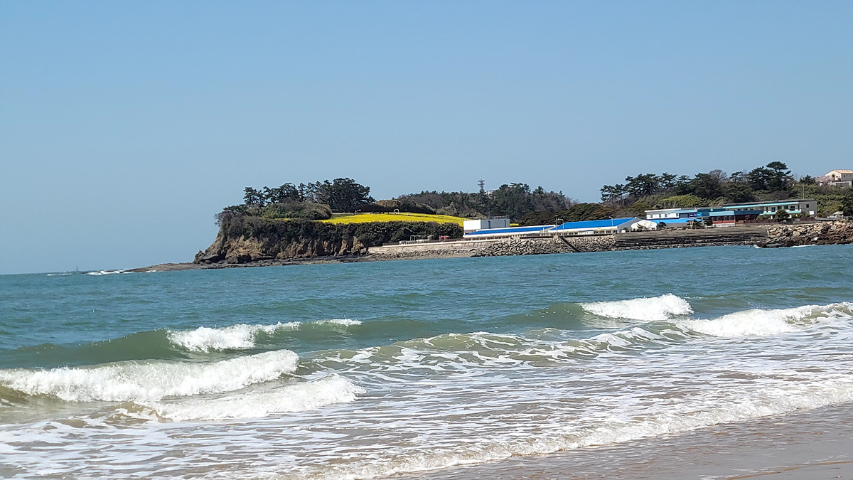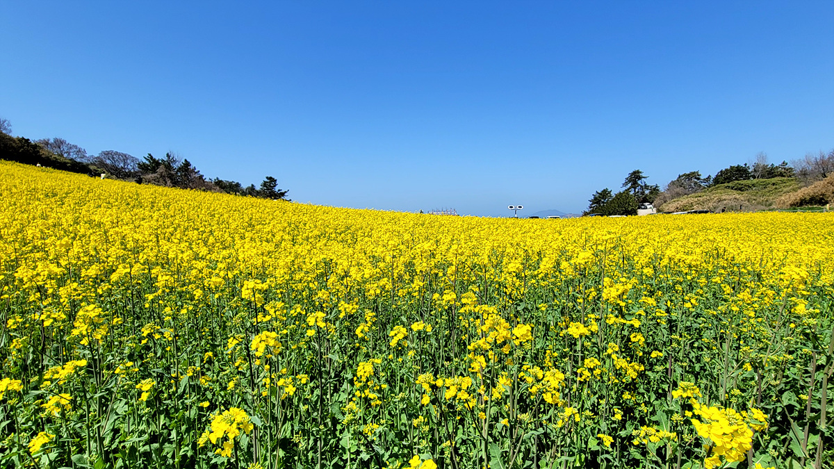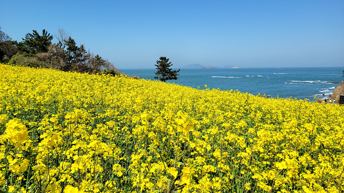 양지바른 해안가에 한쪽에선 유채꽃 무리가