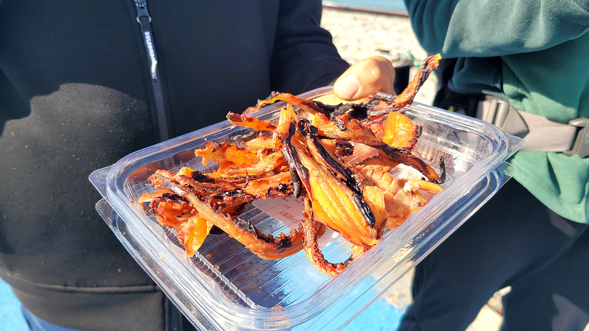 아침 식사는 이렇게 걸으며, 오징어 다리로 해결 중.