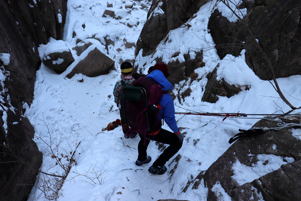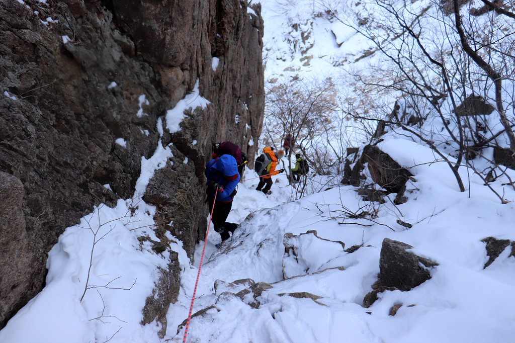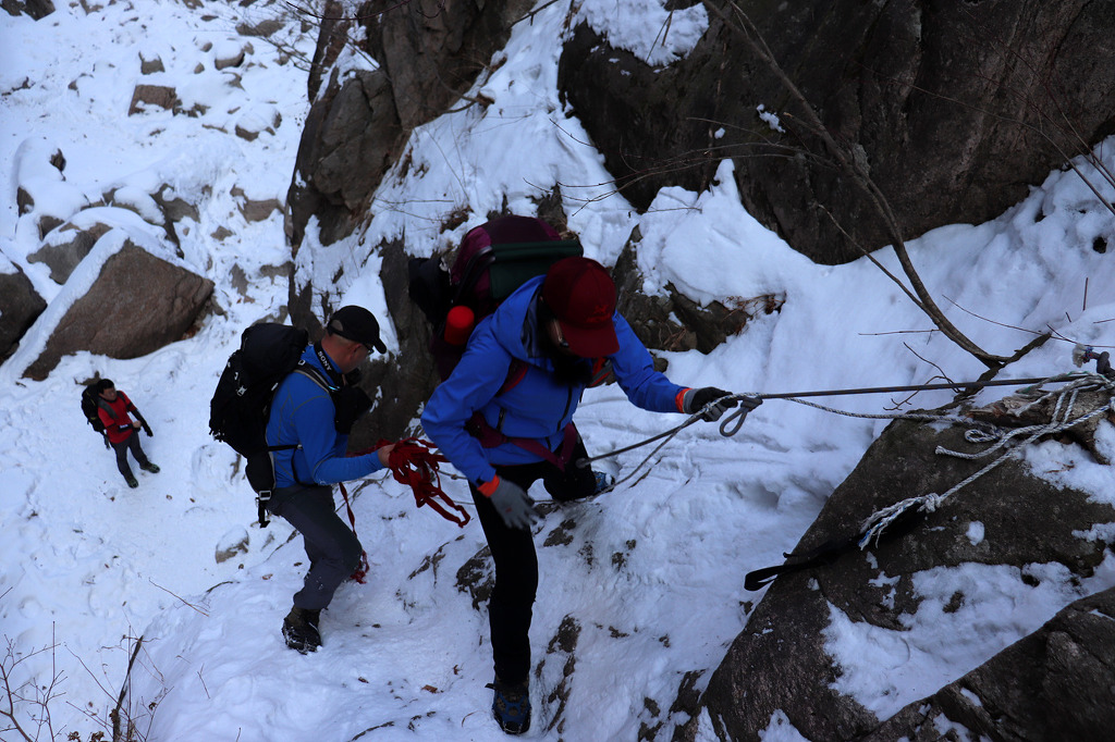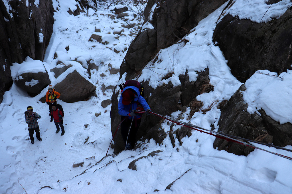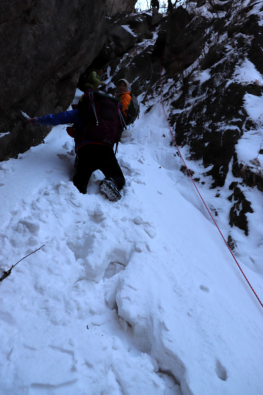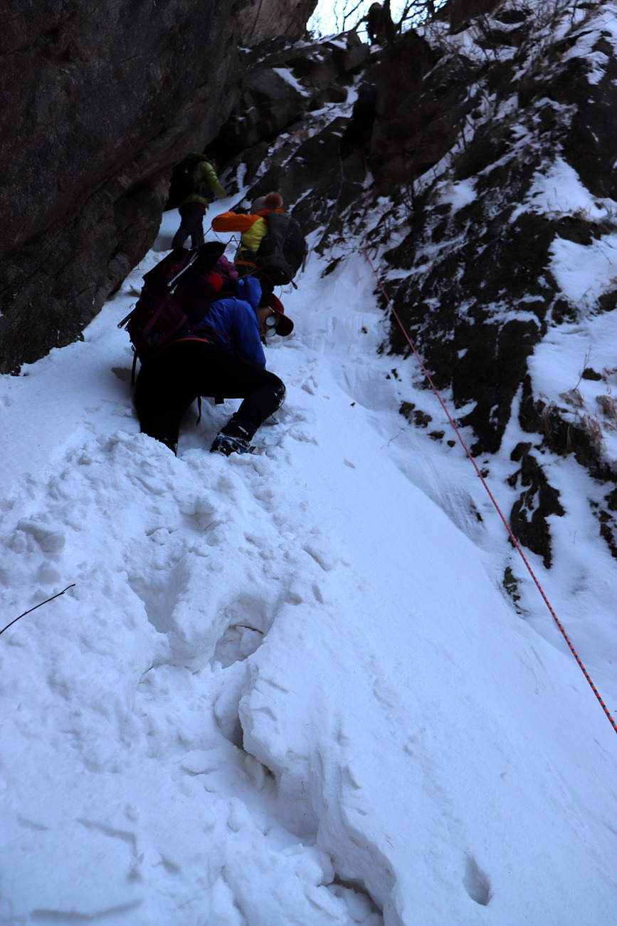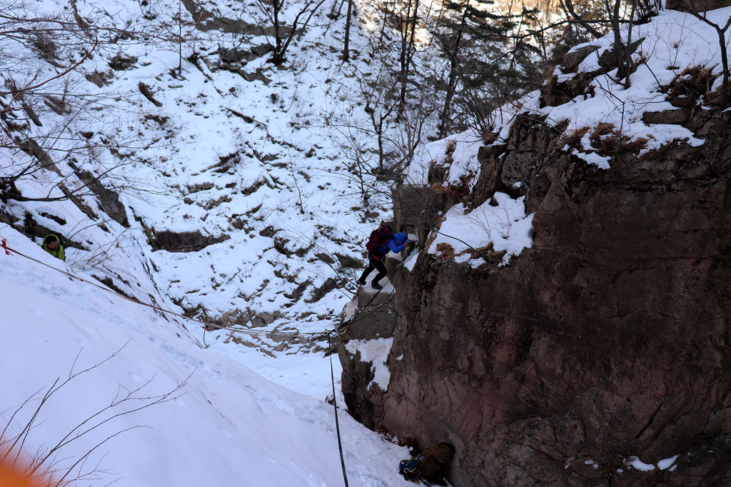 겨울 골짜기들어가는데 보조자일도 없고..슬링하나밖에.. 보조자일을 사용하라고 줍니다