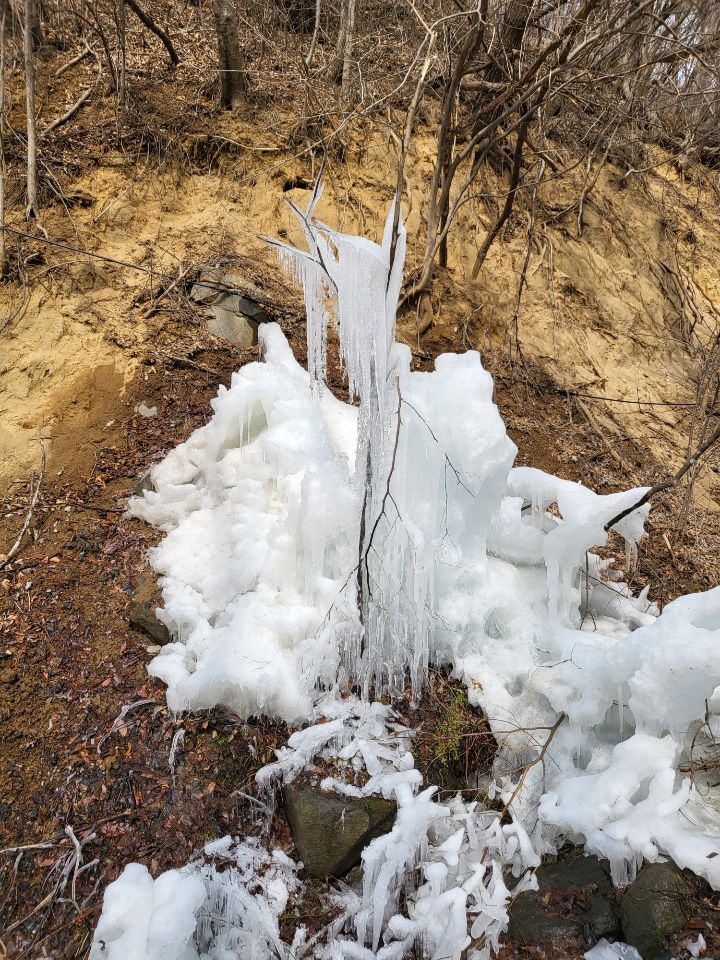 산행초입 호수에서 세는물이 얼은거야.