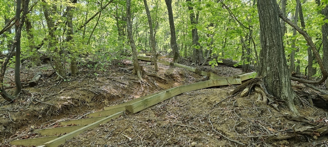 내면 분소에서 임도길 따라 5KM가량 오르면 산길로 오르는 674개 정도의 3단으로 된 나무 계단이 나온다.
