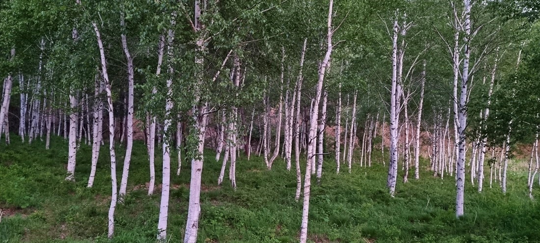건봉사에서 도로따라 걸어 나오며 본 자작나무 군락지