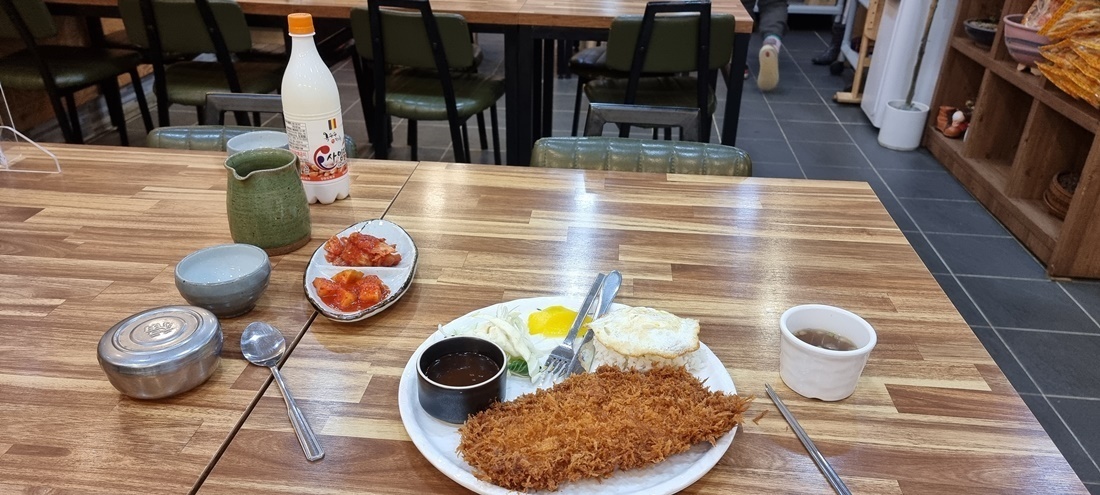 돈가스 하나 시키니 여주인께서 막걸리 한 병을 주신다.
