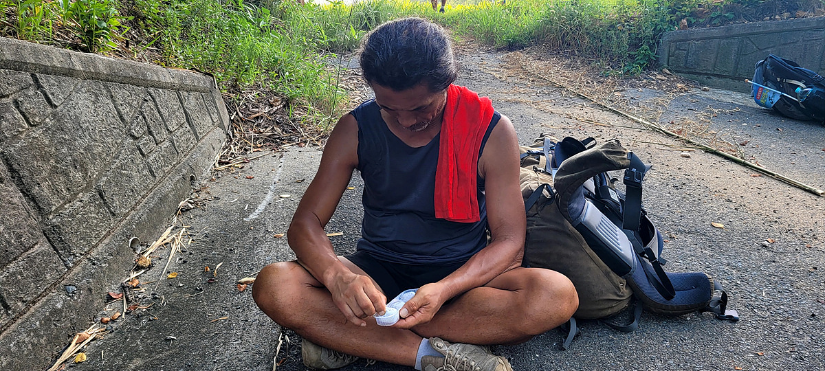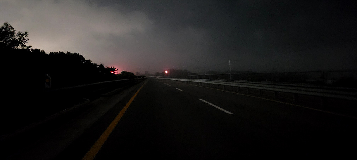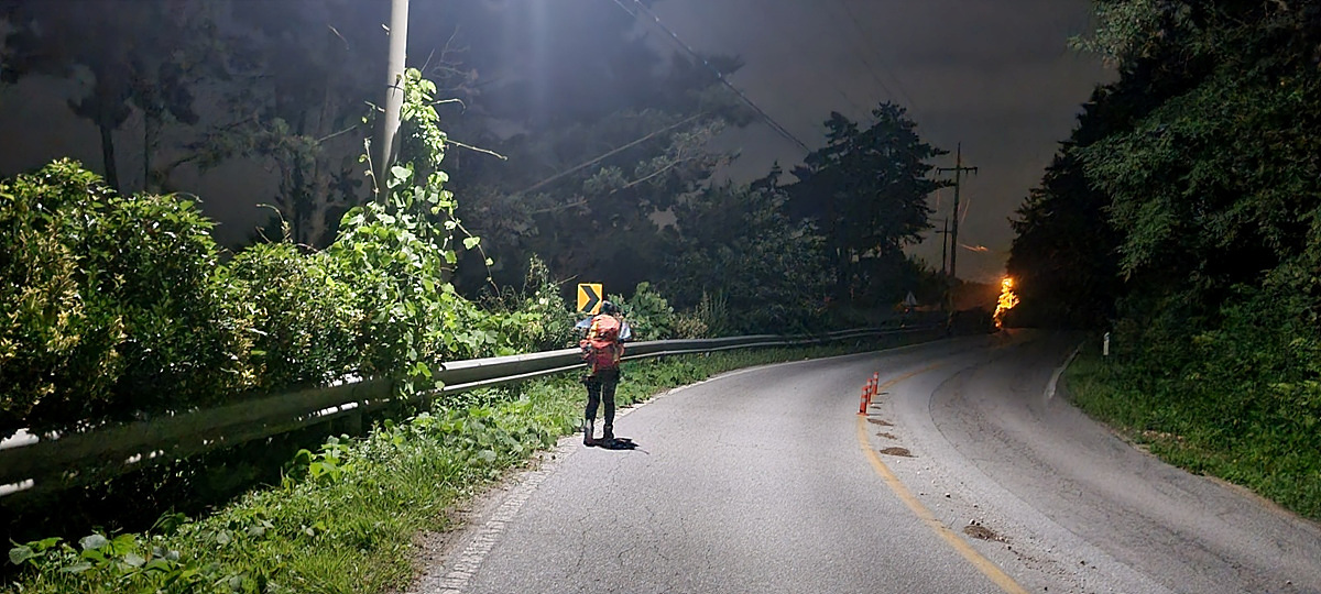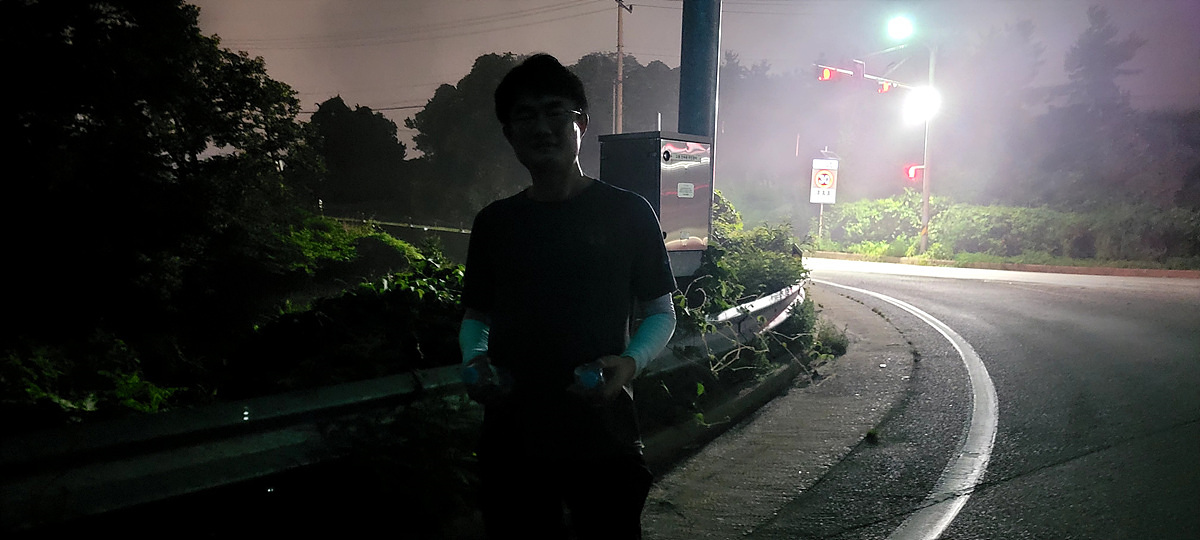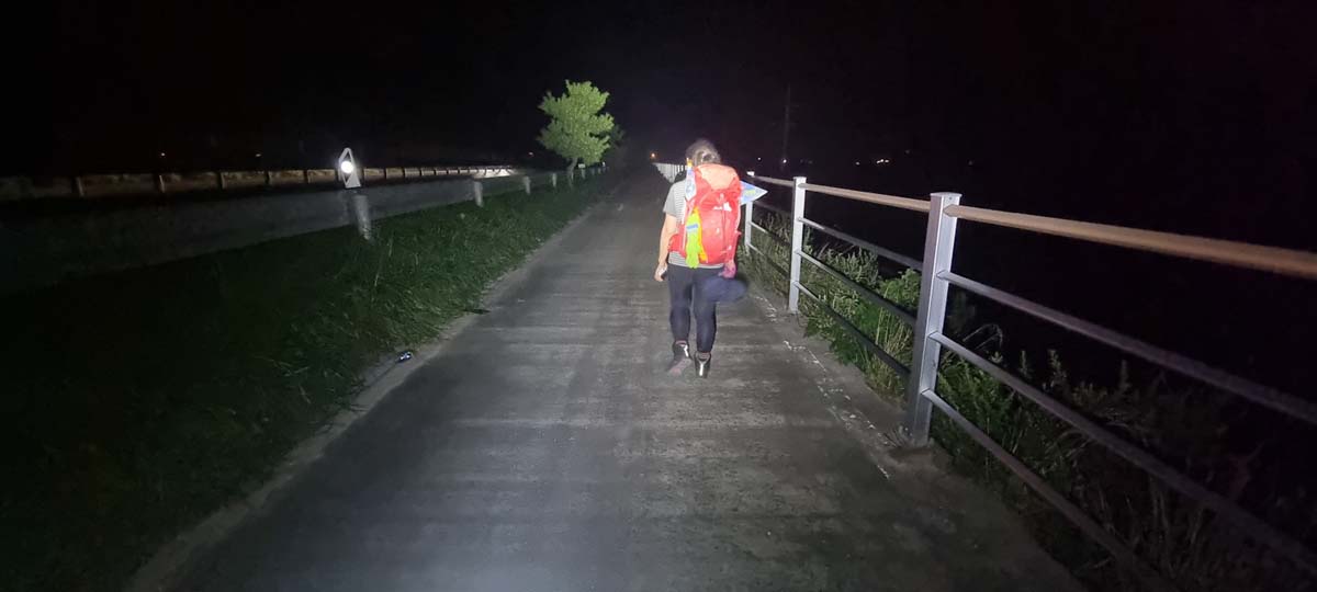 도로 따라 걸어 저녁 8시 30분까지 60km를 걸어 정확히 트랭글상 400km 완주!