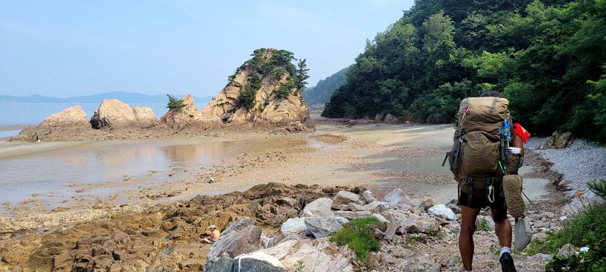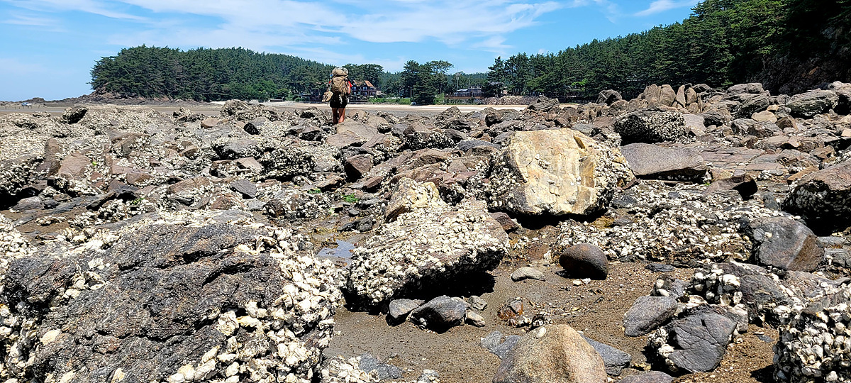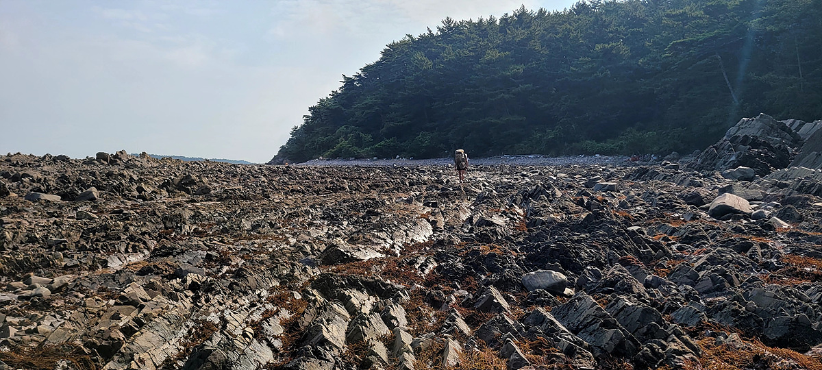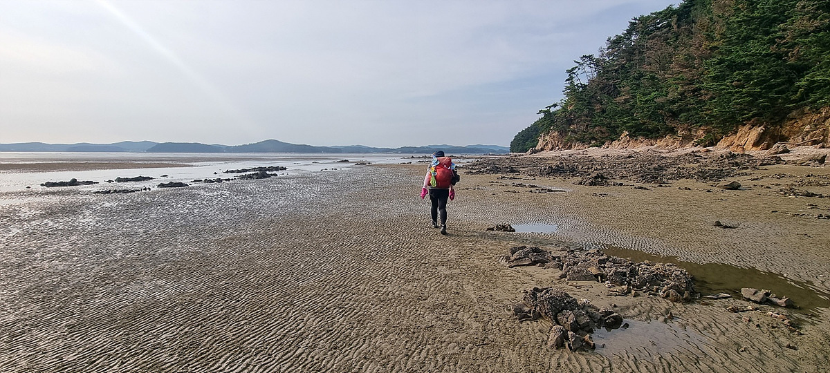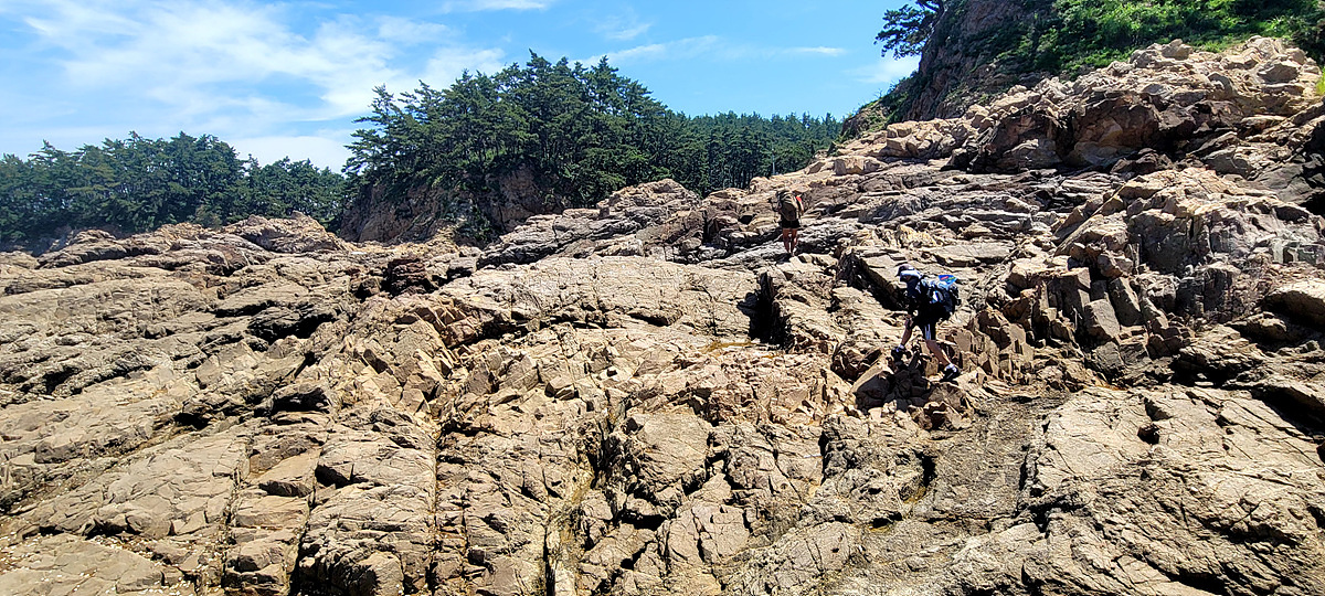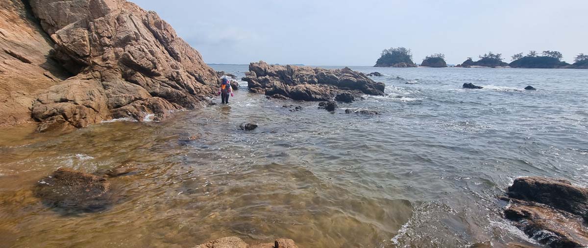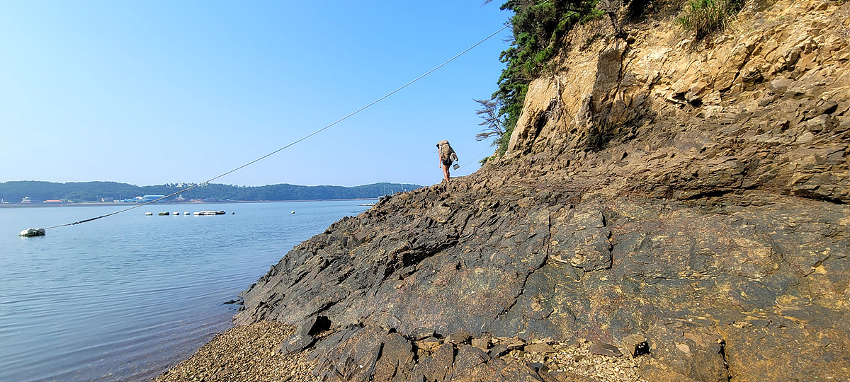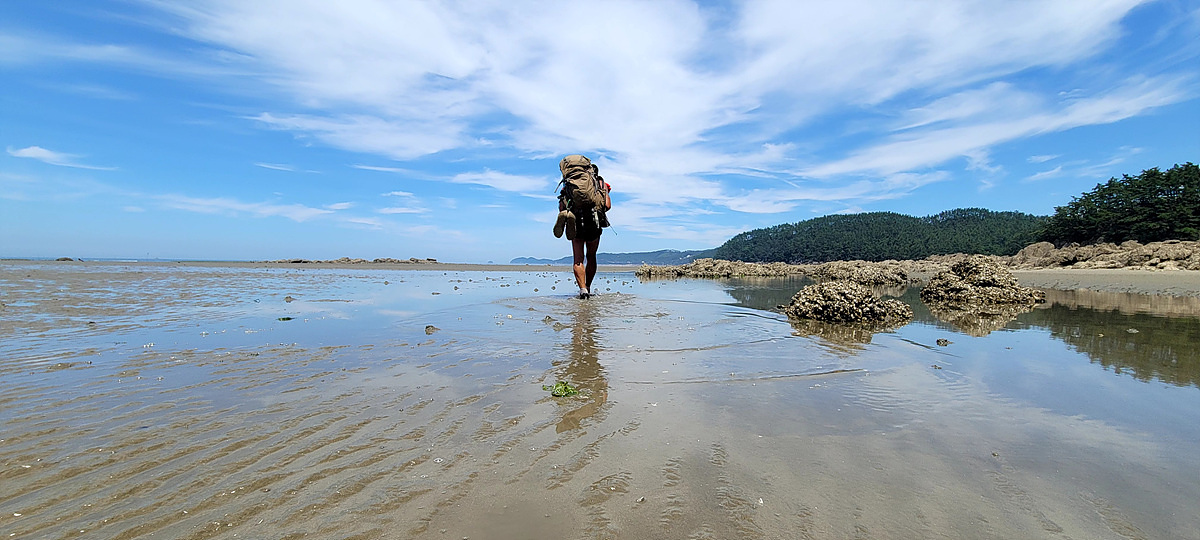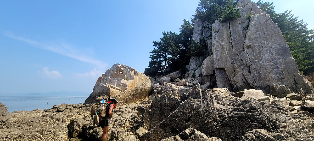 허벅지 허리 높이의 바닷물, 모래, 푹푹~ 갯벌, 자갈, 뾰족뾰족 바위, 암릉, 비탈, 산길 등...