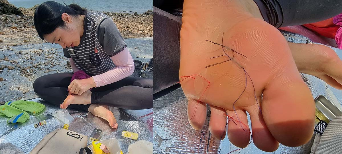 발 상처에서 진물과 피가 흐르고 있는데도