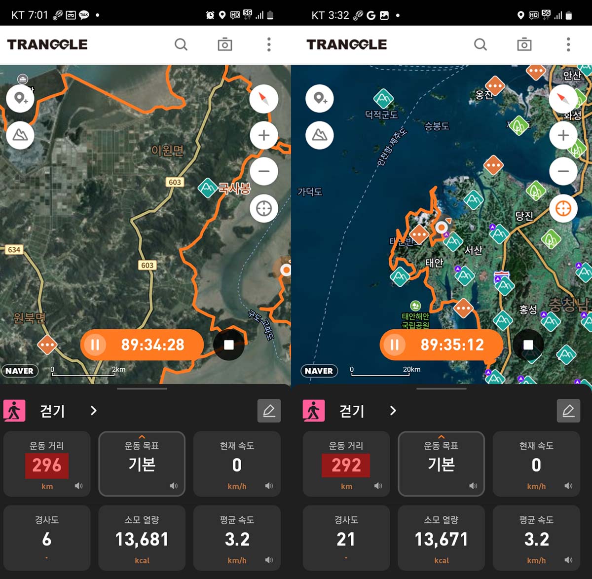 일반 도로로만 걸음시 하루 평균 60~65km정도는 걸어줘야